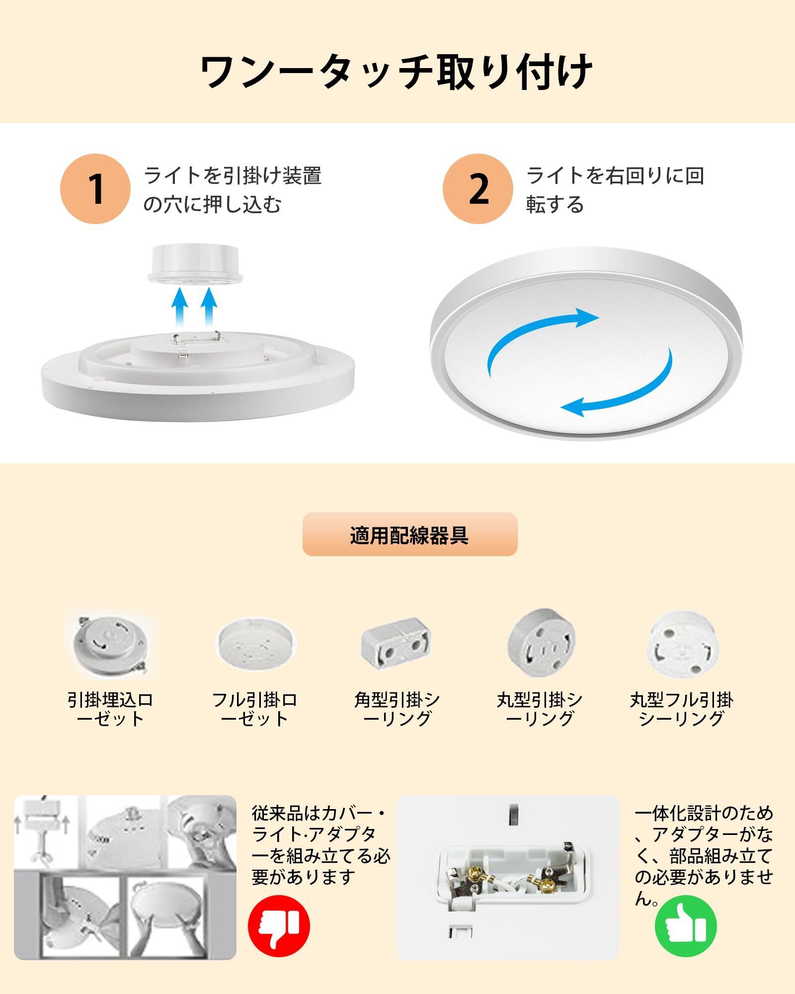 【【簡単取り付け&様々な場所で使用可能】ledシーリングライトはアダプターと本体の一体型設計を採用しており、複雑な部品の組み立ては不要です。照明を取り付ける際には、本体をプッシュして時計回りに回すだけで簡単に取り付けが完了します。工具や配線は必要ありません。不慣れな方でも説明書を見るだけでかんたんにシーリングライトを天井に取り付けることができます。このシーリングライトは、和室、寝室、バスルーム、リビングルーム、玄関、オフィス、廊下、店舗など、さまざまな場所で使用できます。
