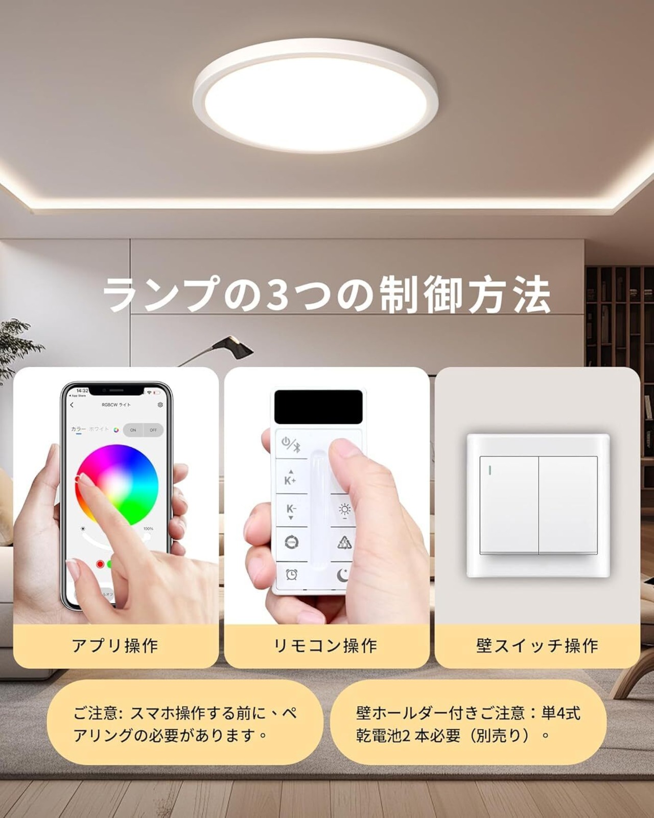 【リモコン&スマートフォン操作】2.4GHzリモコン:最大20メートルの範囲で、角度を問わずシーリングライトを操作できます(注意:赤外線リモコンではありません)。照明 天井には、リモコンを紛失しないよう、リモコン用フックも付属しています(リモコンには単4電池が必要です。電池は別売りです)。スマートフォンアプリの操作:リモコンをなくした場合でも、スマートフォンで簡単にシーリングライトを操作できます(事前にSmart Lifeアプリをダウンロードし、説明書に従ってシーリングライト 6畳とペアリングする必要があります)。