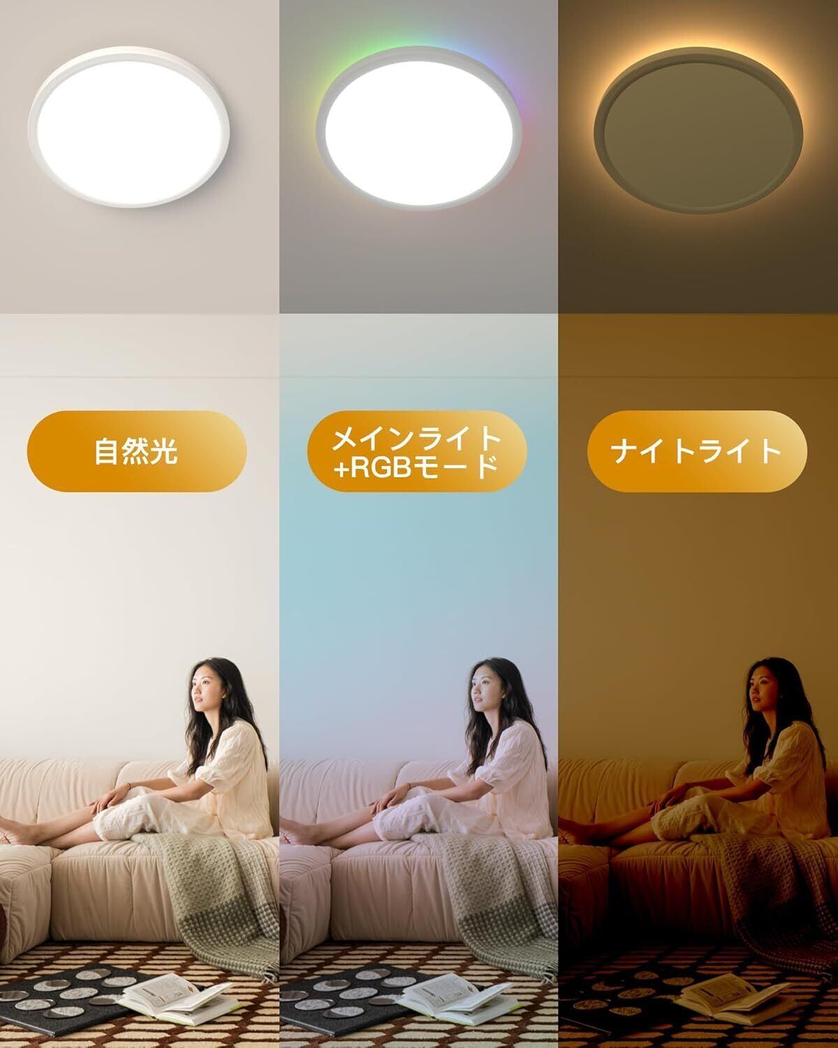 【新機能:ledシーリングライト+RGB+ナイトライトモード】:シーリングライト28W+RGB6W+ナイトライト1W。シーリングライトは、専用のスリープモードがリモコンに設定されています。ledシーリングライトは、低消費電力のナイトライトも搭載しており、子供部屋でお子さまの独り寝デビュー、夜の授乳、お年寄りの介護などに非常に最適です。シーリングライトのバックライトは、ムードライトまたはナイトライトとして使用でき、ナイトライトは光が直接目に入らないため、通常の天井照明よりも柔らかく、優しい光になります。RGBシーリングライト、無限のカラーから好きな光を選択でき、部屋のムードを自由にカスタマイズできます。リラックスした雰囲気からアクティブな環境まで、すべてのシーンに対応します。このスタイリッシュなシーリングライトは、6畳または8畳の部屋用です。シーリングライト 6畳でお部屋をゴージャスな雰囲気に変えましょう。(バックライトとメインライトは色調を調整でき、個別にオン/オフできます。)