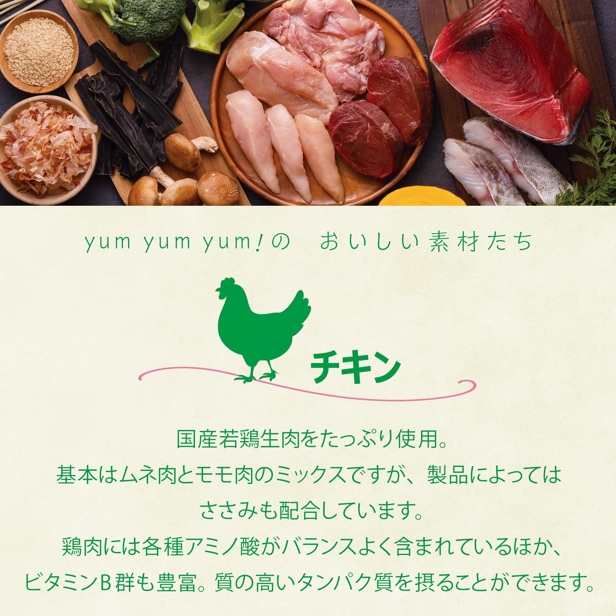 【10歳以上のシニア犬のおすすめ】国産の若鶏生肉を使用した獣医師監修のレシピは、低脂肪・高タンパクで、胃腸・関節・皮膚の健康維持に配慮。オールステージ対応の「yum yum yum!チキンドライタイプ」と比較して粗脂肪約30%減(乾物量)。