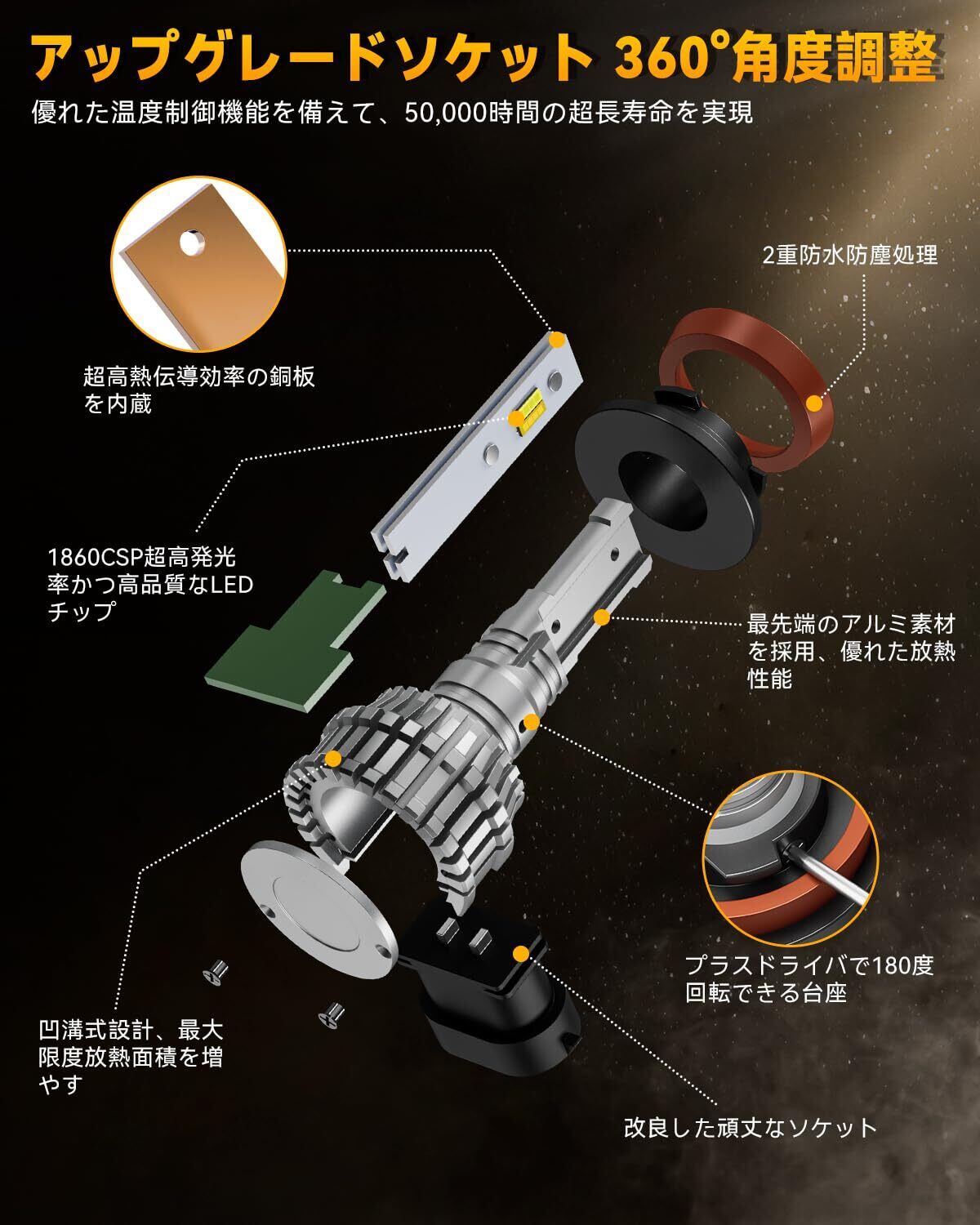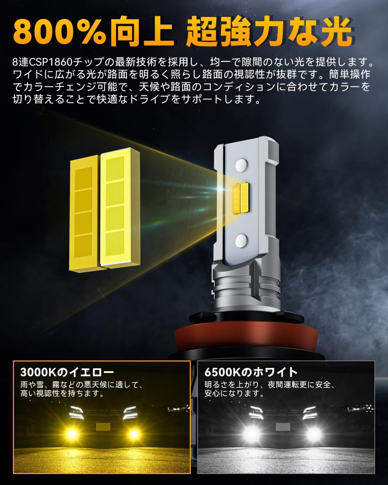 【角度調整&多重放熱機能による長寿命】色モデルだと、光軸が切り替えるとズレてしまう?実際に合わせてフォグランプの角度を簡単に調整したかった?熱対策の心配なく長く使用したい?こちらのh8 led フォグなら、180度回転可能な3Dアジャスターにスプリングロック機構を搭載。プラスドライバ1本でお車のリフレクターに合わせて白光やイエローの向きを調整していただけます。JASMA認証の配光パターンが保安基準をクリアし、車検時の照射角度検査を容易に実施。自社改良した高品質かつ爆光なCSP1860チップを4基配置し、均一で隙間のない光を提供します。35ワットのパワーで、点灯不良や消灯、暗いエリアなどの問題も解決しています。超高熱伝導効率の銅板に最先端のアルミ素材を採用し、加えて底の凹溝式設計など、高効率の熱伝導設計と内蔵の温度管理システムにより三重構造で、連続点灯時でも表面温度を安定動作範囲内に抑制。