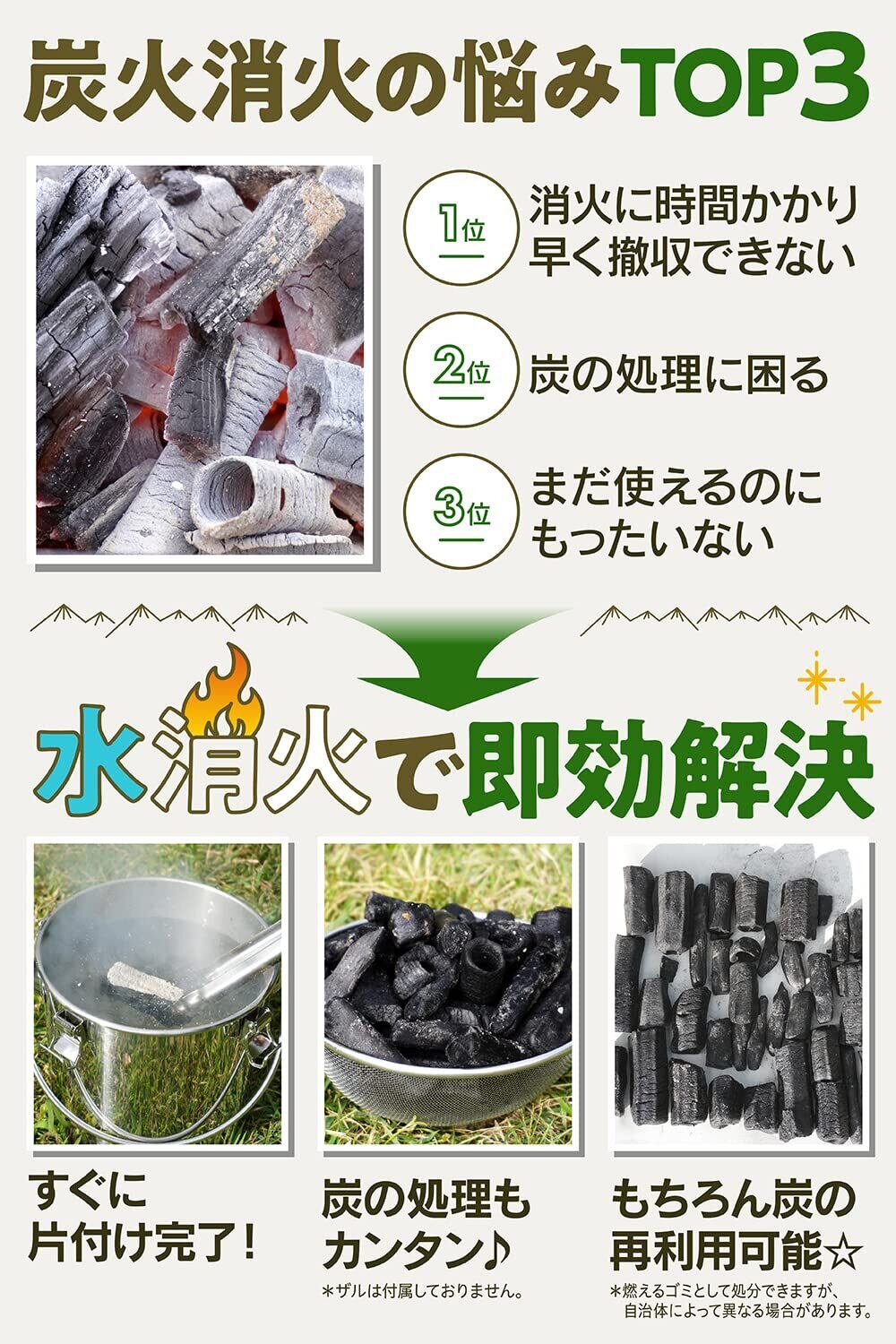 【秒速消火】水消火でラクラク片付け。デイキャンプやBBQ時に即撤収でき、車の運搬も簡単です。炭を乾燥させれば、再利用できます。 酸欠消火は鎮火に時間がかかりますが、後片付けが楽ちんです。残った消し炭は着火しやすく、次回の火おこしに使えます。