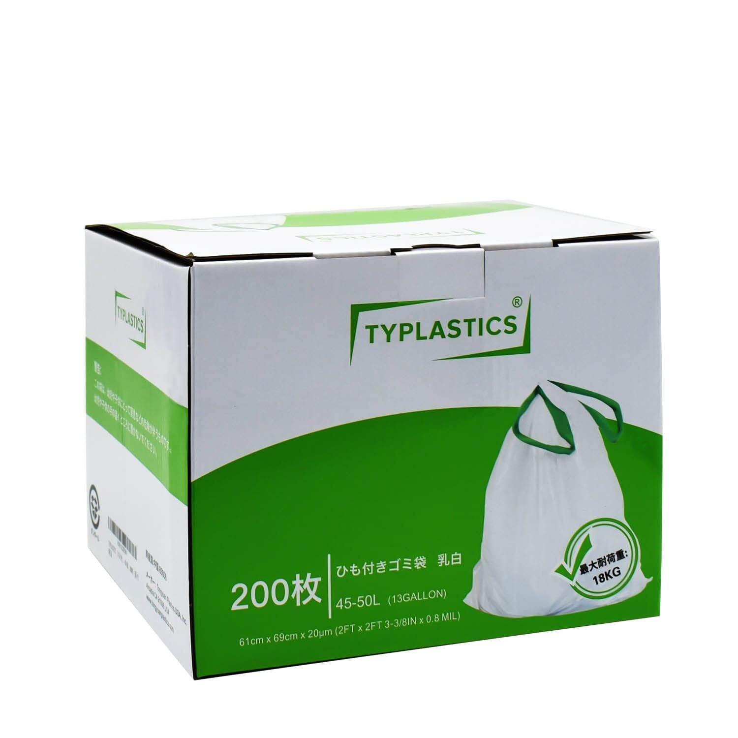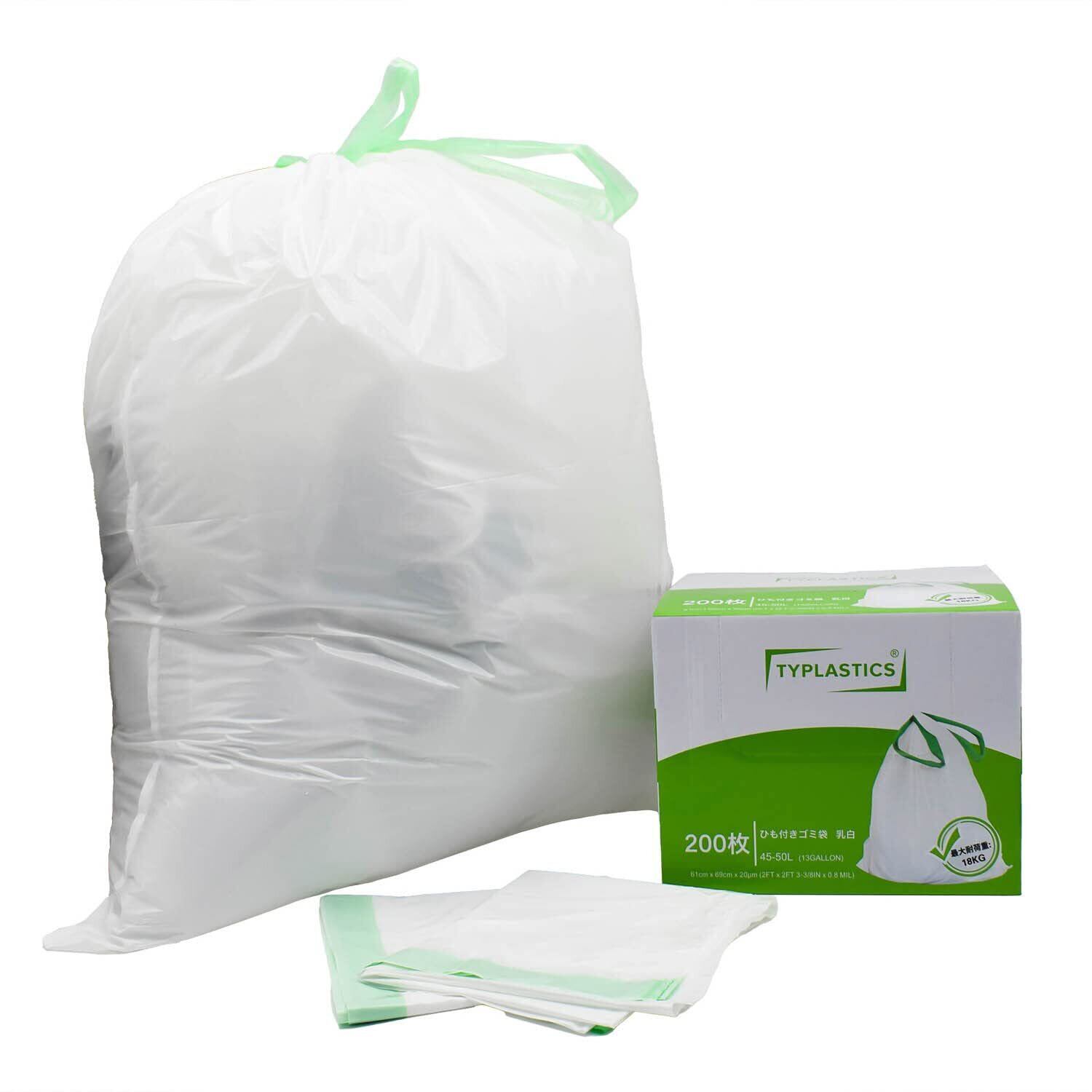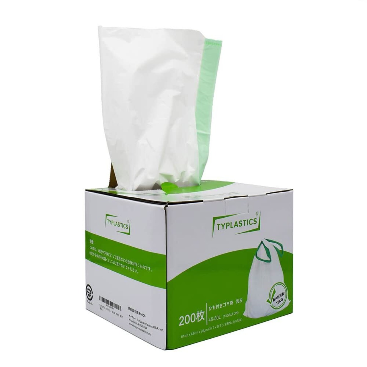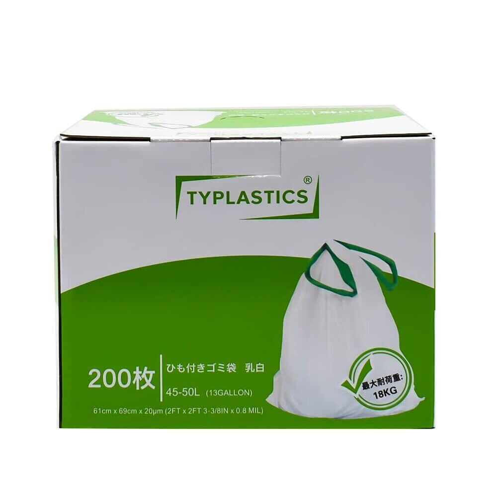 【数量限定】TYPLASTICS ひも付きゴミ袋 乳白 45-50L 200枚 箱入り 破れにくい 一本でごみ捨て