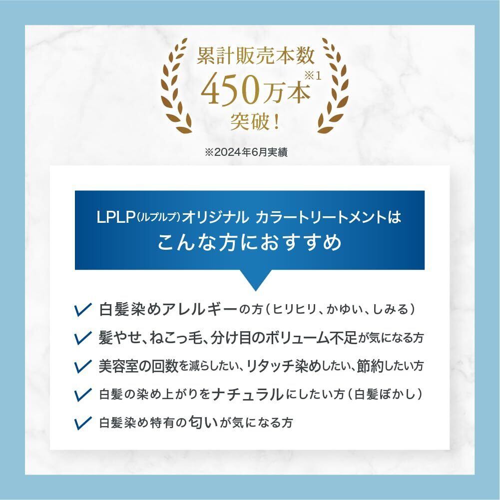 ※ご注文時に置き配を選択いただけますが、実際の配送では対応できない場合がございます(宅配ボックス含む)【染めるほどしっとり潤う、頭皮と髪にやさしい白髪染め】LPLP オリジナル カラートリートメントは、髪の健康と美しさを考えた「トリートメントタイプ」の白髪染め。5つの植物オイルや94%*の美容成分、そして、独自成分「ルプルプ Wフコイダン(シオノギ海藻エキス)」を配合。トリートメントしながら白髪ケアができ、自然な潤い髪へと導きます。※精製水含む