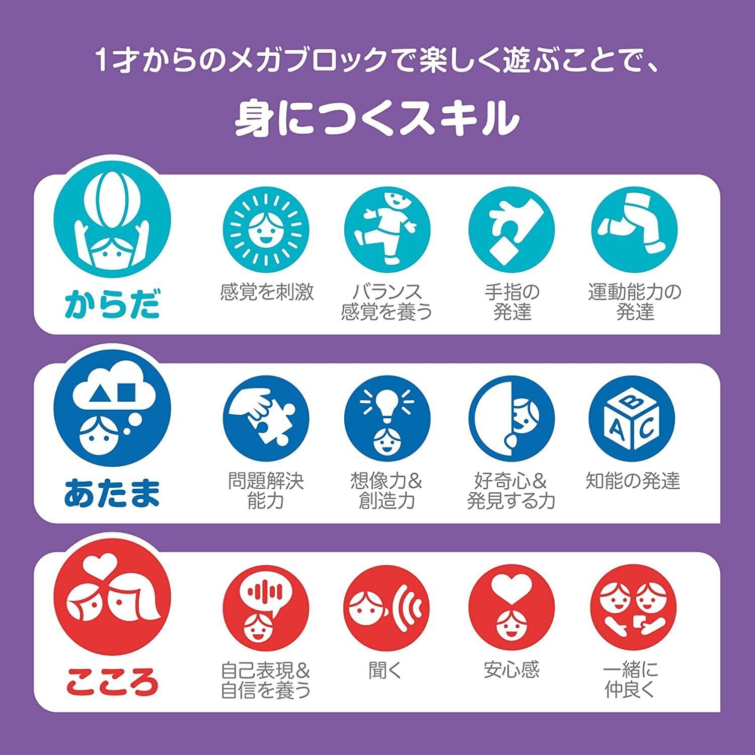 【内容】1~3才のお子さま向けに特化して開発された、メガサイズのブロックたっぷり150個セット、特殊パーツ入り。適度な固さの特別に大きなサイズのブロックは、小さなお子さまでも重ねたり、はずしやすい設計。ストレスなく夢中になって遊べます。