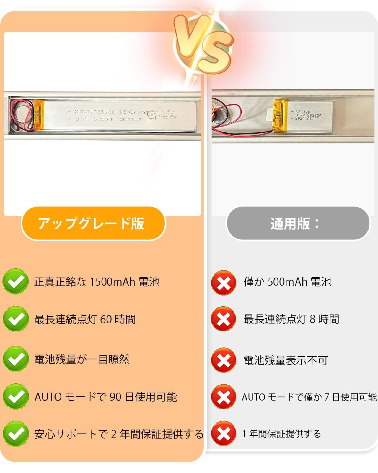 【連続点灯60時間・1500mAh電池内蔵・残量が一目瞭然】こちらの人感センサーライトは最低電力で60時間使うことができます、最高電力で6時間使うことができます。「AUTO」モードでは約1~3ヶ月持続できます。急速充電設計、充電完了まで2時間しかかかりません。バッテリー残量と設定が一目でわかる。気になる電池残量も一目でわかるので突然消えたなど心配不要!バッテリー残量が分かれば適切なタイミングで充電することができ、過放電や過充電を未然に防ぎます。