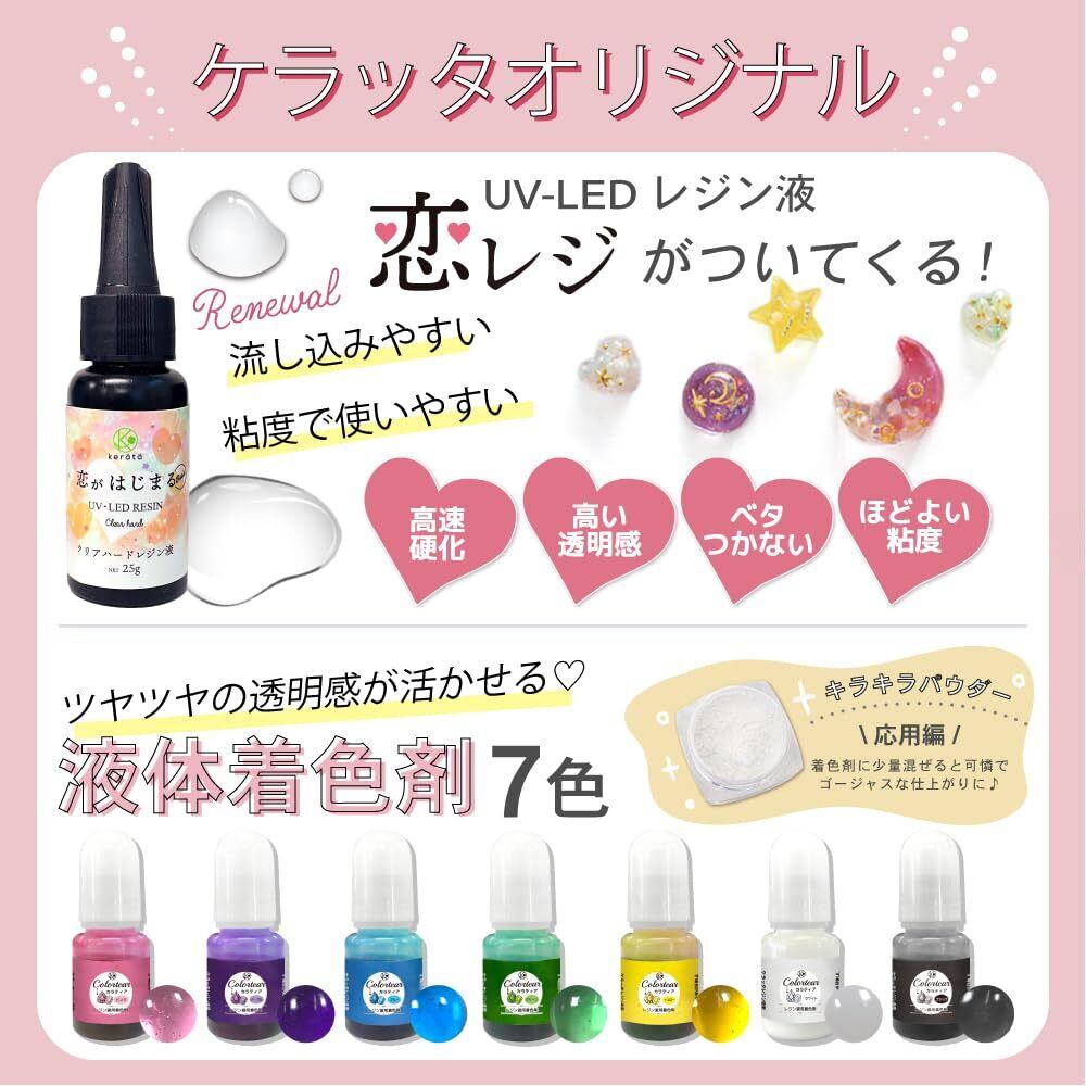 【オリジナルレジン液「恋レジ」付き】ケラッタのオリジナルレジン液「恋レジ」が付いてくる!透明度に自信、アクセサリー作りに特化したレジン液だから作ったアクセサリーがいつまでもかわいく、長持ちします!UV-LED対応だから付属のライトであっという間に硬化するのもうれしいポイント