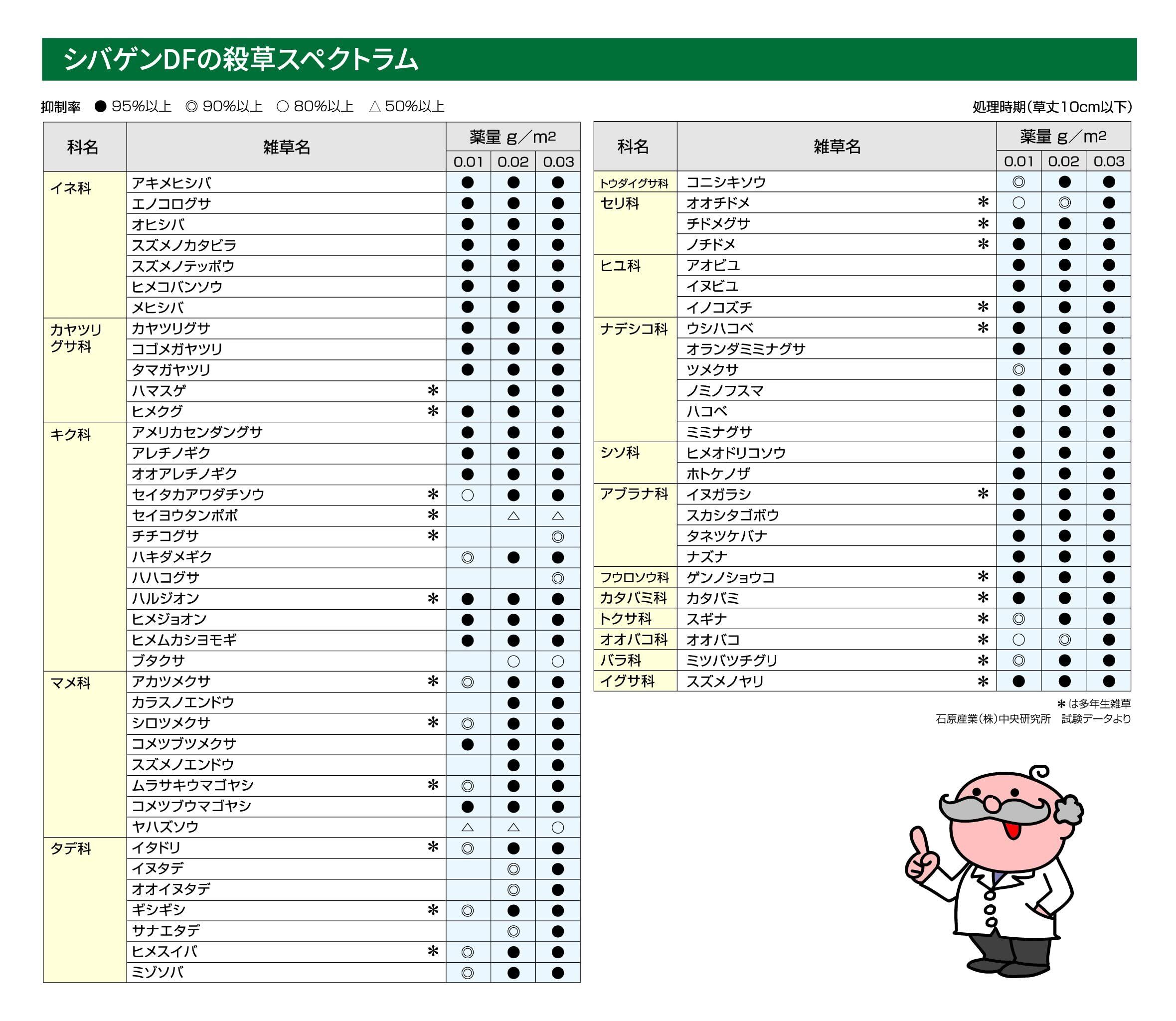 広葉雑草のうちイヌホオズキ、オオイヌノフグリ、セイヨウタンポポ、ツユクサには効果が劣るので、これら雑草が優占する場所では使用をさけてください。