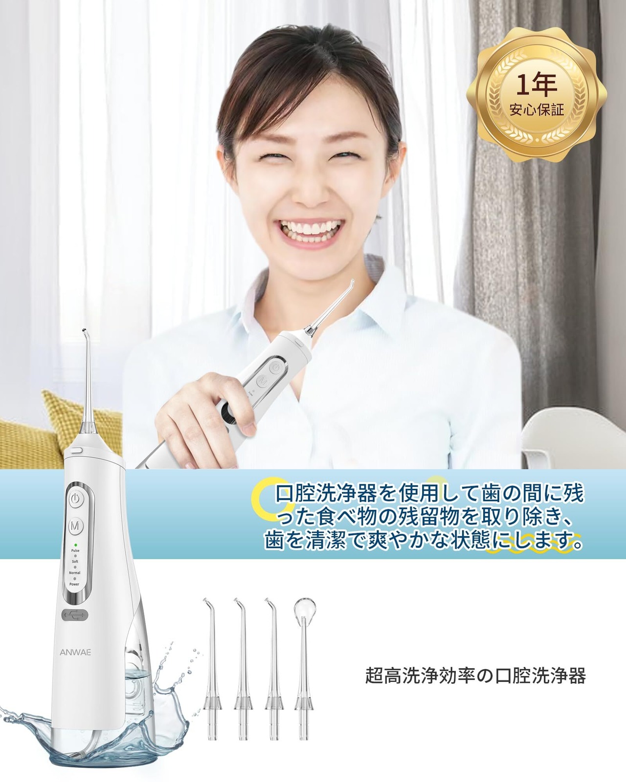 口腔洗浄器 ジェットウォッシャー ANWALE 替えノズル4本 4種類の水流モード 310MLタンク USB充電式 IPX7防水 口腔洗浄機器 WHITE