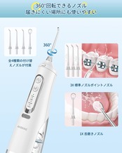 「豊富な付属ノズル・IPX7防水」標準ノズルだけではなく、タングクリーナーノズル*1付属して、合計4本の替えノズルが付属しており、本格的なお口ケアが家でできます。