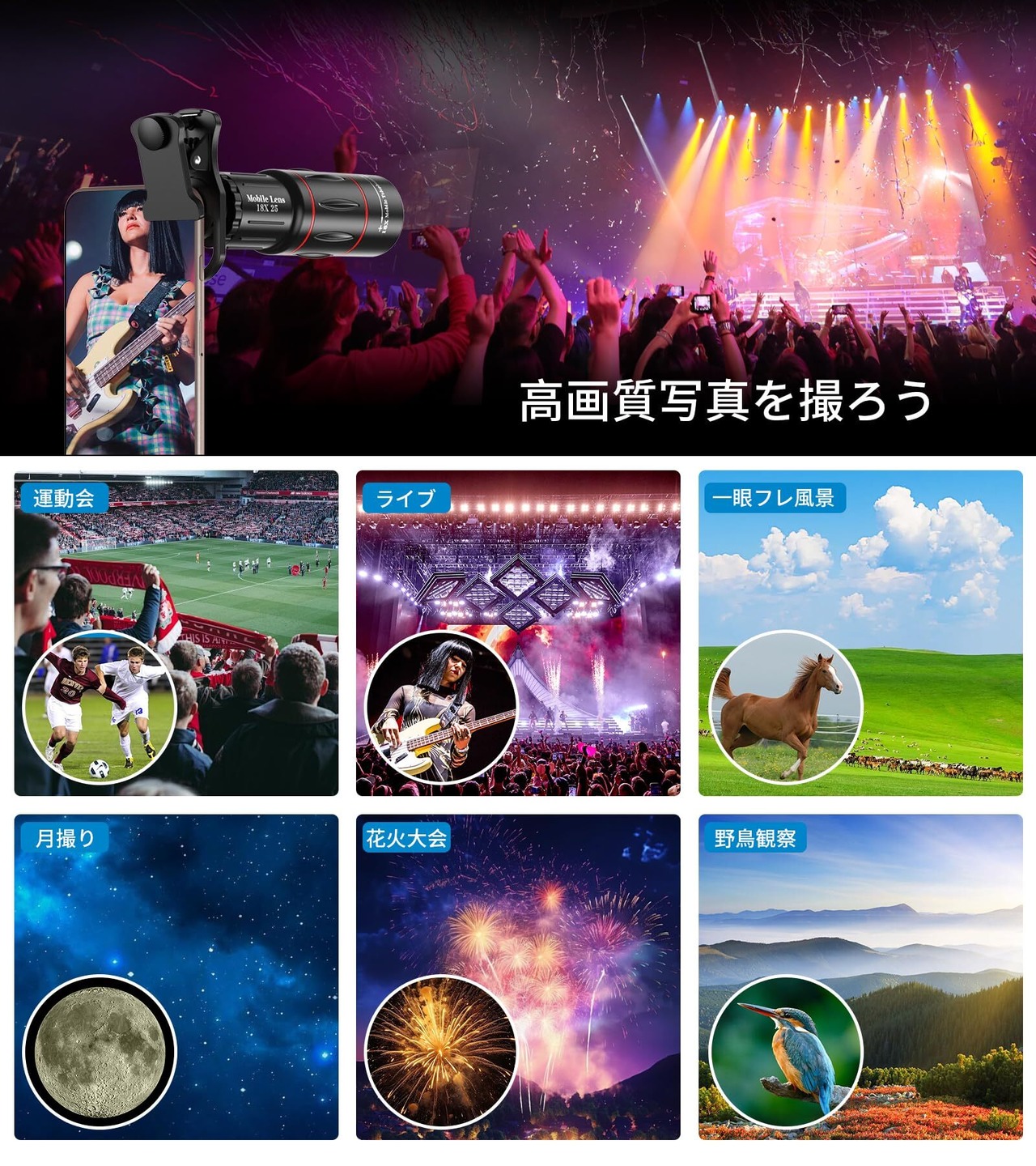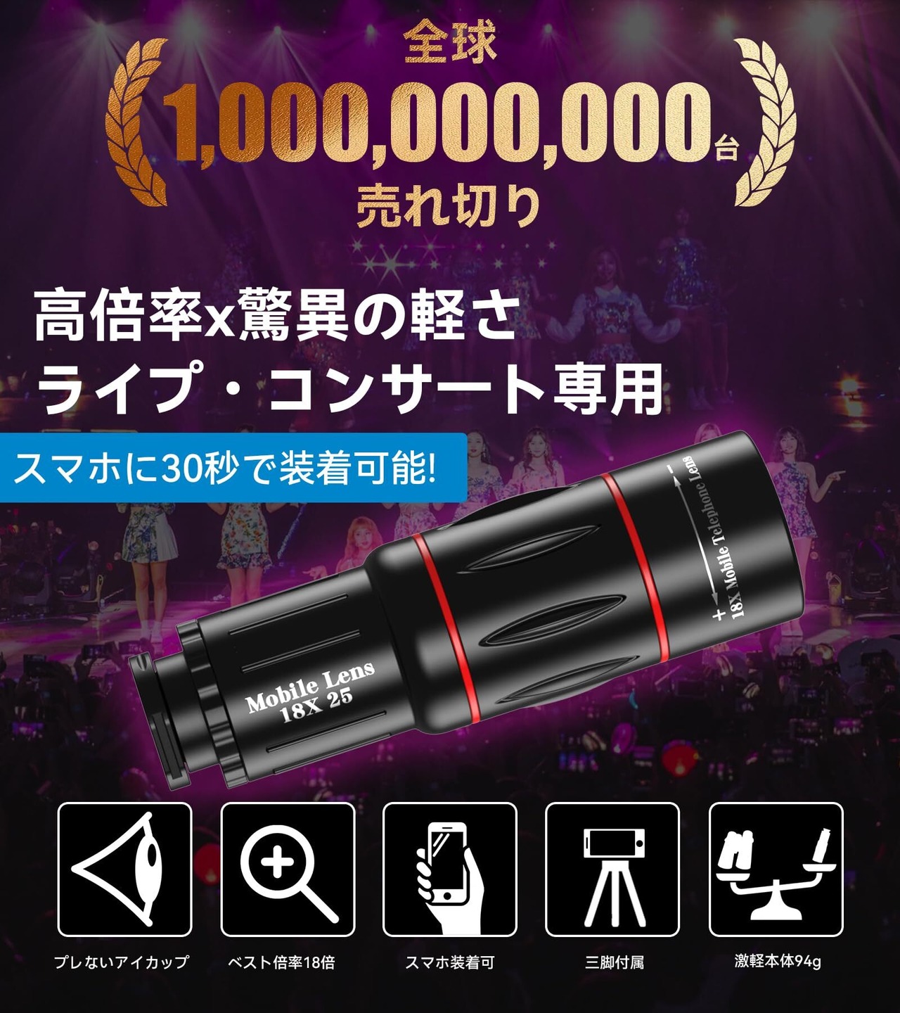 【ライブ・コンサート用望遠レンズ】6倍望遠レンズなら推し顔みえない、60倍なら撮影距離が遠くて推しの髪しか見えない、18倍ならちょうどいい!スマホに挟むだけで、スマホの大きいスクリーンで推しの顔を見ることができます。手のひらサイズは持ちやすい、片手で持つこともできます。一つ手は望遠レンズ、一つ手は応援ライト!