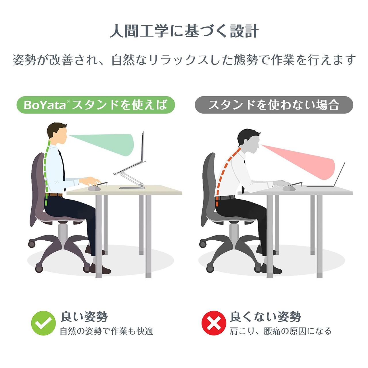 【無段階角度・高さ調整可能】●人間工学に基づいて設計により、PC作業時、角度・高度を無段階調整可能で自分に最適な高度まで調整できるパソコンスタンド!●デスクが低いためデスクワークの際に腰に負担がかかってしまっていたが、Boyataスタンドを使うことによってパソコンを目線と同じ高さにする事で背筋が伸び、猫背などを有効に防止、背中が丸まりにくくなって、リモートワーク時代の必需品 !!