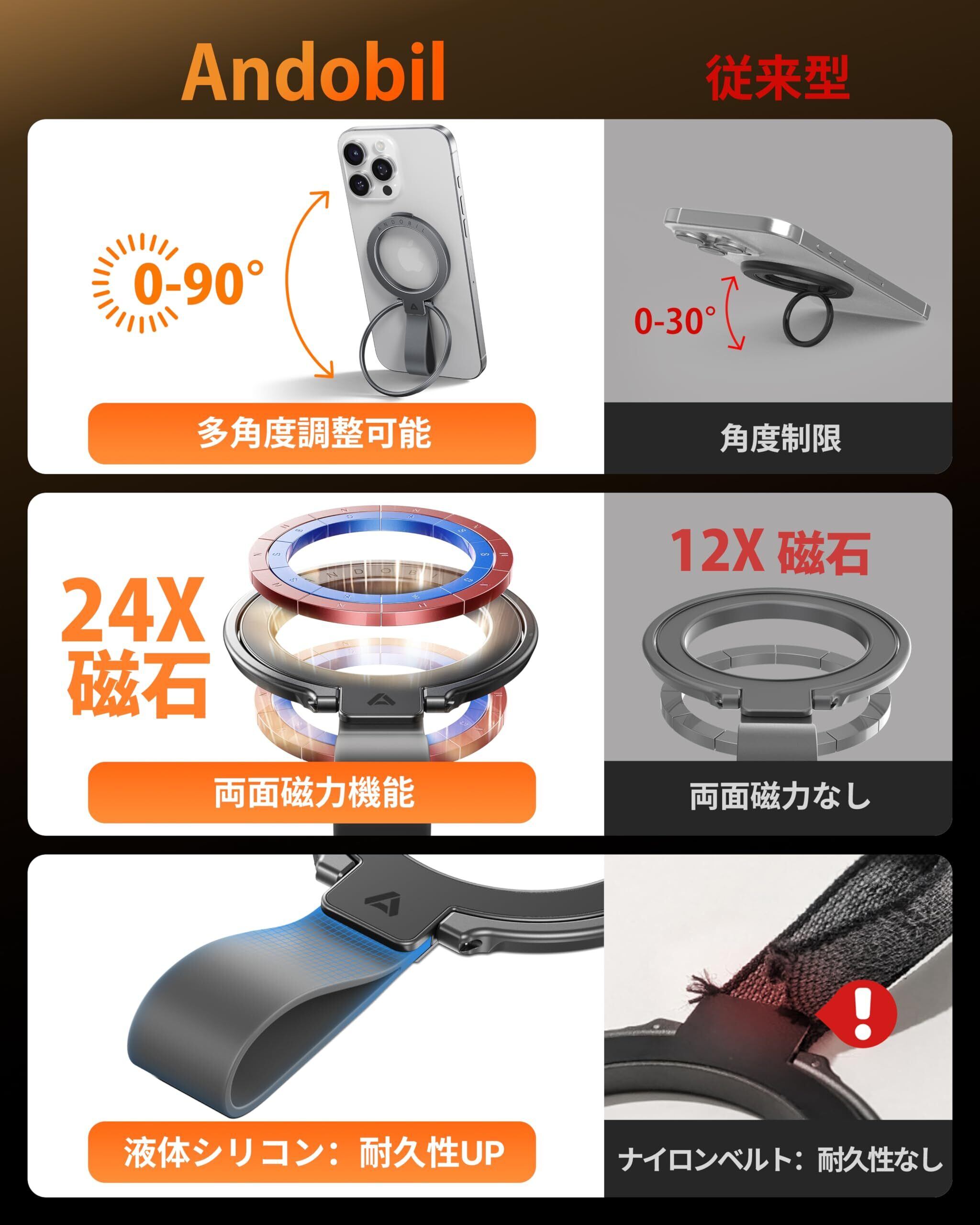 ①✨【無段階角度調整】固定された視野に縛られる時代は終わりです!MagStand Proは0度から90度までの無段階調整に対応しており、縦画面でTikTokから横画面でYouTubeの長編動画まで、常に最も快適な視聴角度を簡単に見つけることができます。「視野が合わない」ストレスとは、もう無縁です。②✨【独自の強化ヒンジ構造】スタンドのぐらつきや破損にお困りではありませんか?MagStand ProはAndobil独自の強化ヒンジ構造を採用。25万回以上に及ぶ厳格なテストをクリアし、5年以上の長期使用に耐える設計を実現しました。どの角度でもしっかりとスマホを支え、安心してご使用いただけます。③✨【革新的な大型リング設計】なぜ当社のリングは大きいのか?その答えは「圧倒的な安定性」です。MagStand Proの大型リングは、机との接地面を拡大し、置くだけで1秒で安定。何度も調整する必要がなく、スマホ操作中もリングがぐらつくことはなく、小型リングにありがちな横揺れのストレスから解放され、快適な使用感を実現します。MagStand Proを選べば、スマホ使用が驚くほど快適になります。