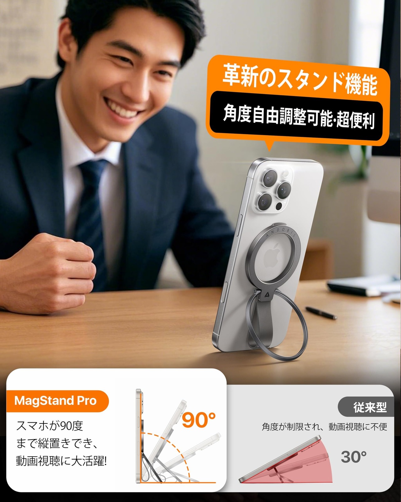 【スタンド機能が全面進化!】本当に実用的なスマホスタンドをお探しなら、「自由な角度調整」「高い安定性」「長期間の耐久性」は欠かせないポイントでしょう。Andobilはそのニーズを深く理解し、それらをすべて満たす進化版スタンド「MagStand Pro」を開発しました。分かりやすくなるように、まずはハイライトから⬇:
