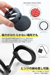 【場所を選ばない】Standの固定部にもマグネットを使用しているため、磁力がはたらく場所ならどこでもStandを吸着させることができます。さらに、MaGdget Stand Plateをお好きな場所に貼付していただくことで、磁力がはたらかない場所でもStandを吸着させることが可能になります。 MaGdget Standには「MaGdget Stand Plate」と「MaGdget Support Plate」が1点ずつ付属いたします。