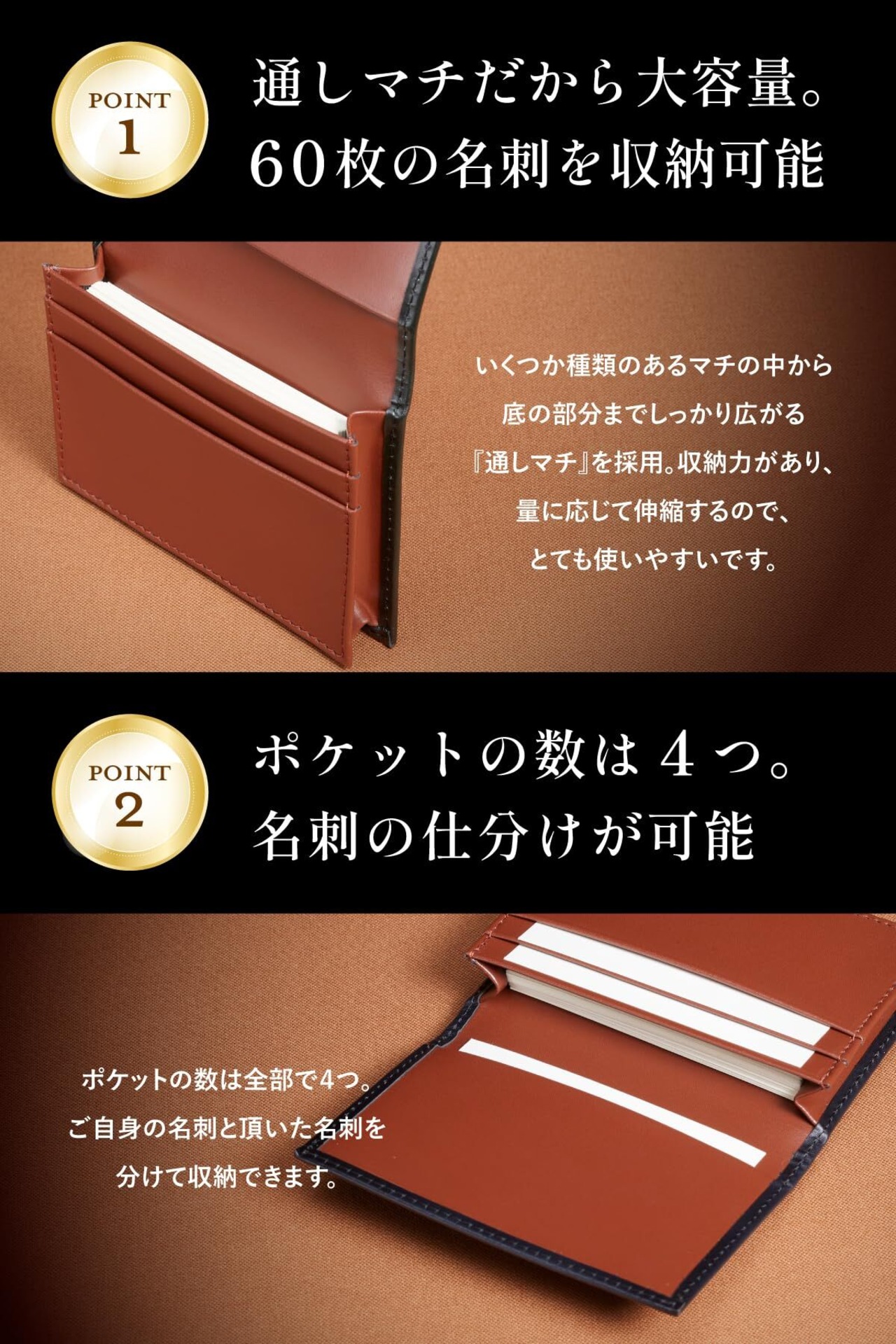 【通しマチだから大容量/60枚の名刺を収納可能】いくつか種類のあるマチの中から底の部分までしっかり広がる『通しマチ』を採用。収納力があり、量に応じて伸縮するので、とても使いやすいです。【ポケット数は4つ】ポケットの数は全部で4つあり、ご自身の名刺と頂いた名刺を分けて収納できます。