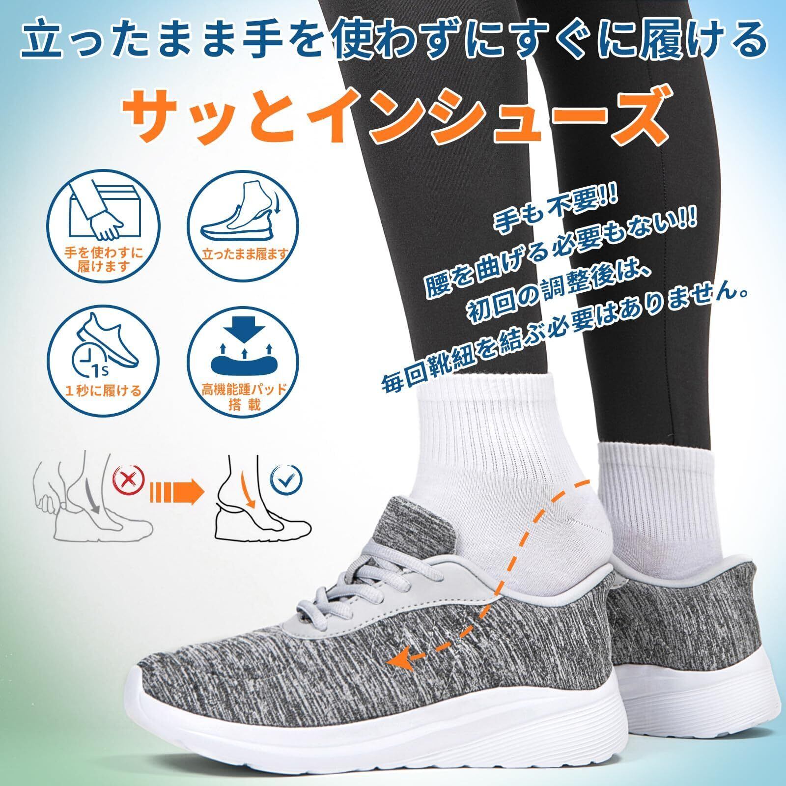 手を使わずに履ける履きやすい靴 スニーカー。その名の通り「手を使わずに 立ったまま スパッと履ける!」特別な作りを実現しました。かがまず履ける。触らず履ける。本当です。アッパーにはソフトなフェザージャージーニットを使用し、柔らかく快適な履き心地を実現。25.0 cm片足で186gと、超軽量設計でストレスフリーな履き心地。 ゆったり感のある幅広EEEウィズ設計。キレイが保てる外せるインソ一ル、低反発素材を使用することで衝撃を吸収してくれます。足を優しく包み込み、負担を軽減するので、ストレスなく履ける快適な履き心地を実現。脱ぎ履きもラクチンでとても便利で、普段履きや室内履きとしてはもちろん、お散歩や運転、介護やナースなどの長時間の立ち仕事、通勤、旅行の際の履き替え用などにもおすすめです。靴を頻繁に着脱する必要のある仕事の人や、年配の人、妊娠中の人も屈まずに靴を履くことができる優しいシューズとなっており、面倒くさがり屋さんにもお薦めだ。