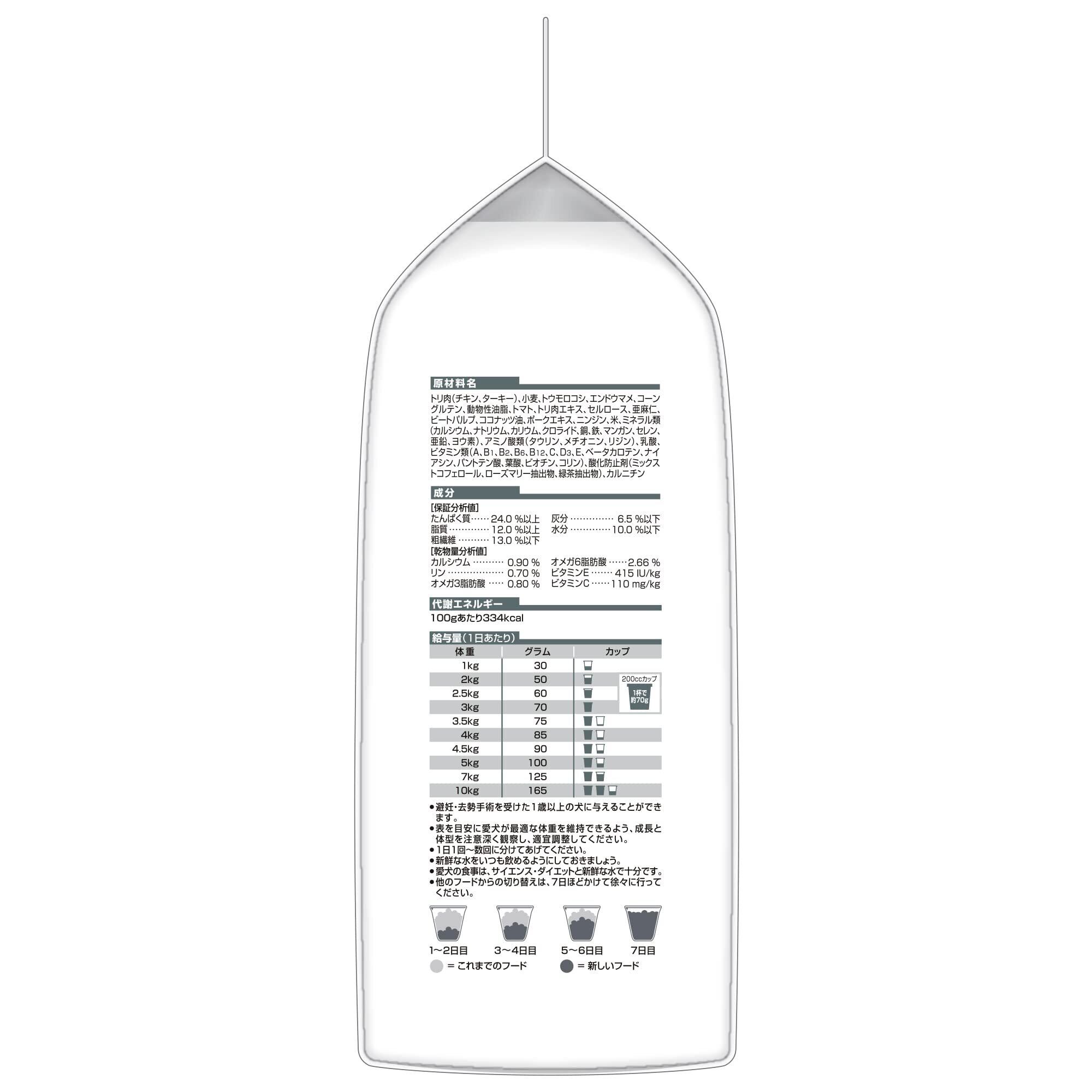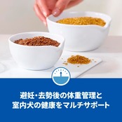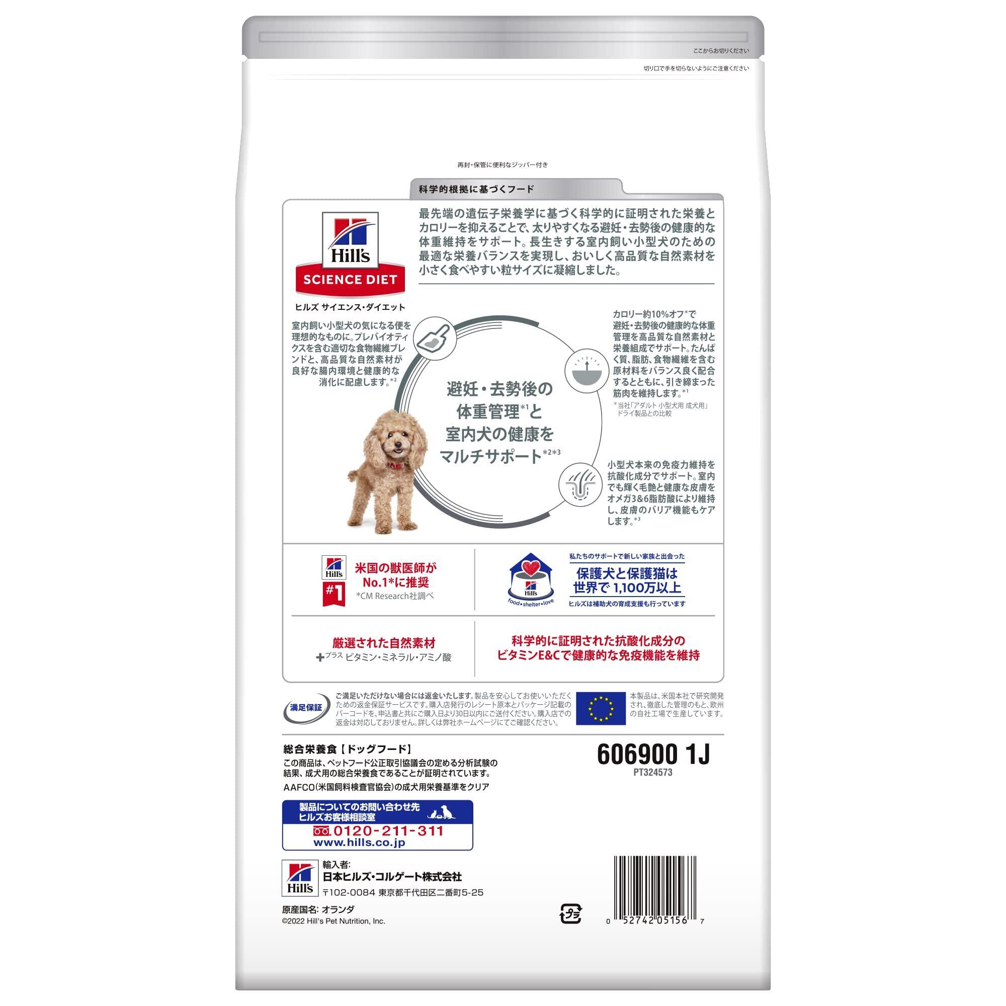 最先端の遺伝子栄養学に基づく科学的に証明された栄養とカロリーを抑えることで、太りやすくなる避妊・去勢後の健康的な体重維持をサポート。 長生きする室内飼い小型犬のための最適な栄養バランスを実現し、おいしく高品質な自然素材を小さく食べやすい粒サイズに凝縮。シニア、高齢犬、成犬のお試しにもおすすめ。カロリー約10%オフ*で避妊・去勢後の健康的な体重管理を高品質な自然素材と栄養組成でサポート。たんぱく質、脂肪、食物繊維を含む原材料をバランス良く配合するとともに、引き締まった筋肉を維持。*1 室内飼い小型犬の気になる便を理想的なものに。プレバイオティクスを含む適切な食物繊維ブレンドと、高品質な自然素材が良好な腸内環境と健康的な消化に配慮。