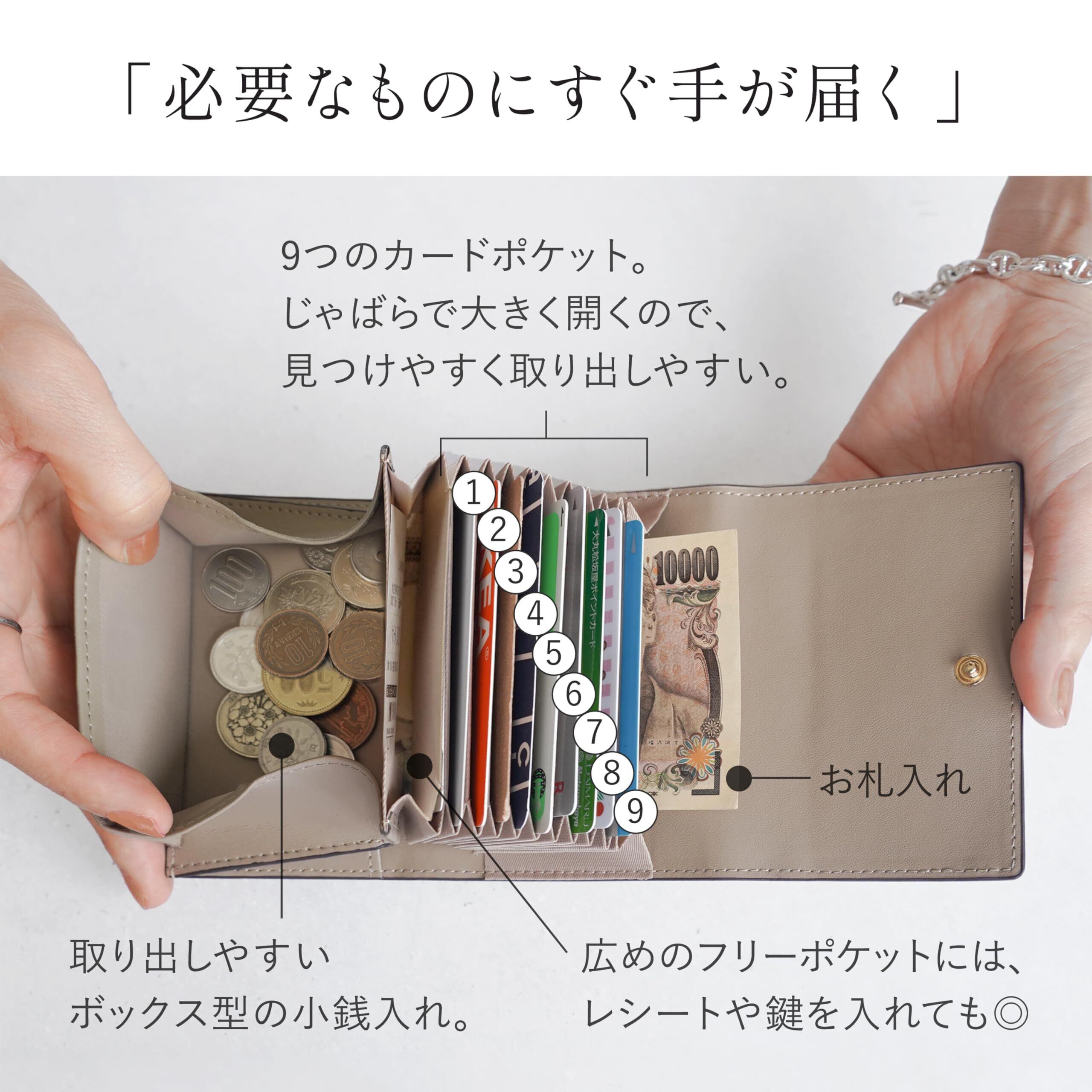 【小さいのに大容量】・ボックス型小銭入れ ・レシートや鍵も入るフリーポケット ・お札入れ ・見つけやすく取り出しやすい9つのじゃばらカードポケット \ミニ財布なのにこんなに入ります/・お札×10枚 ・小銭×20枚 ・カード×9枚