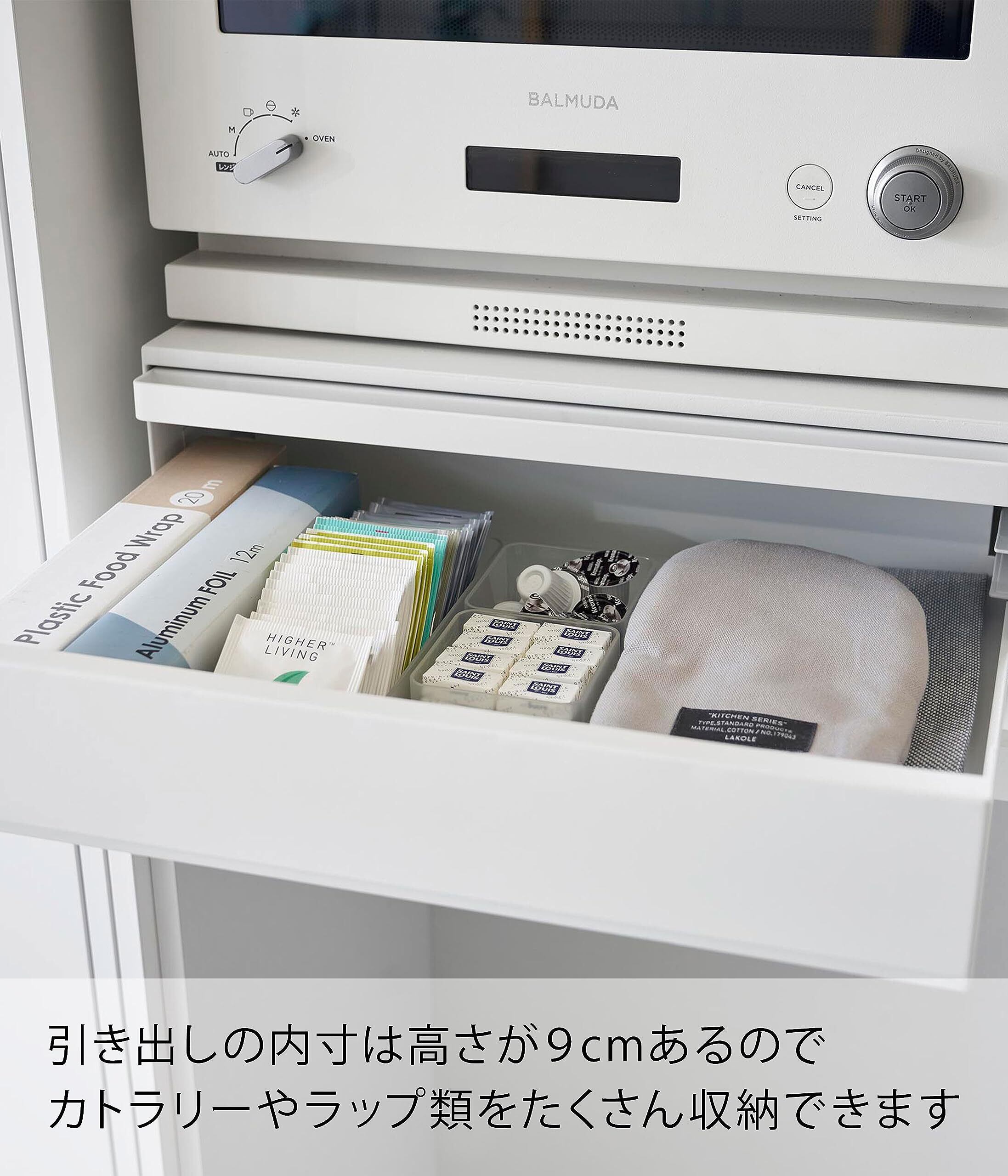 引き出しの内寸は高さが約9cmあるのでカトラリーやラップ類をたくさん収納できます。