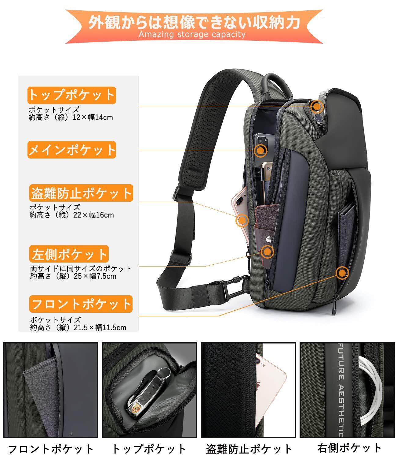 人間工学の斜めがけバッグ:前掛け、後掛け、斜め掛けなど3つの掛け方があります。両肩に付け替え可能。体にフィットするよう人間工学に基づいた設計となっております。長時間持ち歩いても疲れにくく、アクティプなお出かけにも対応。