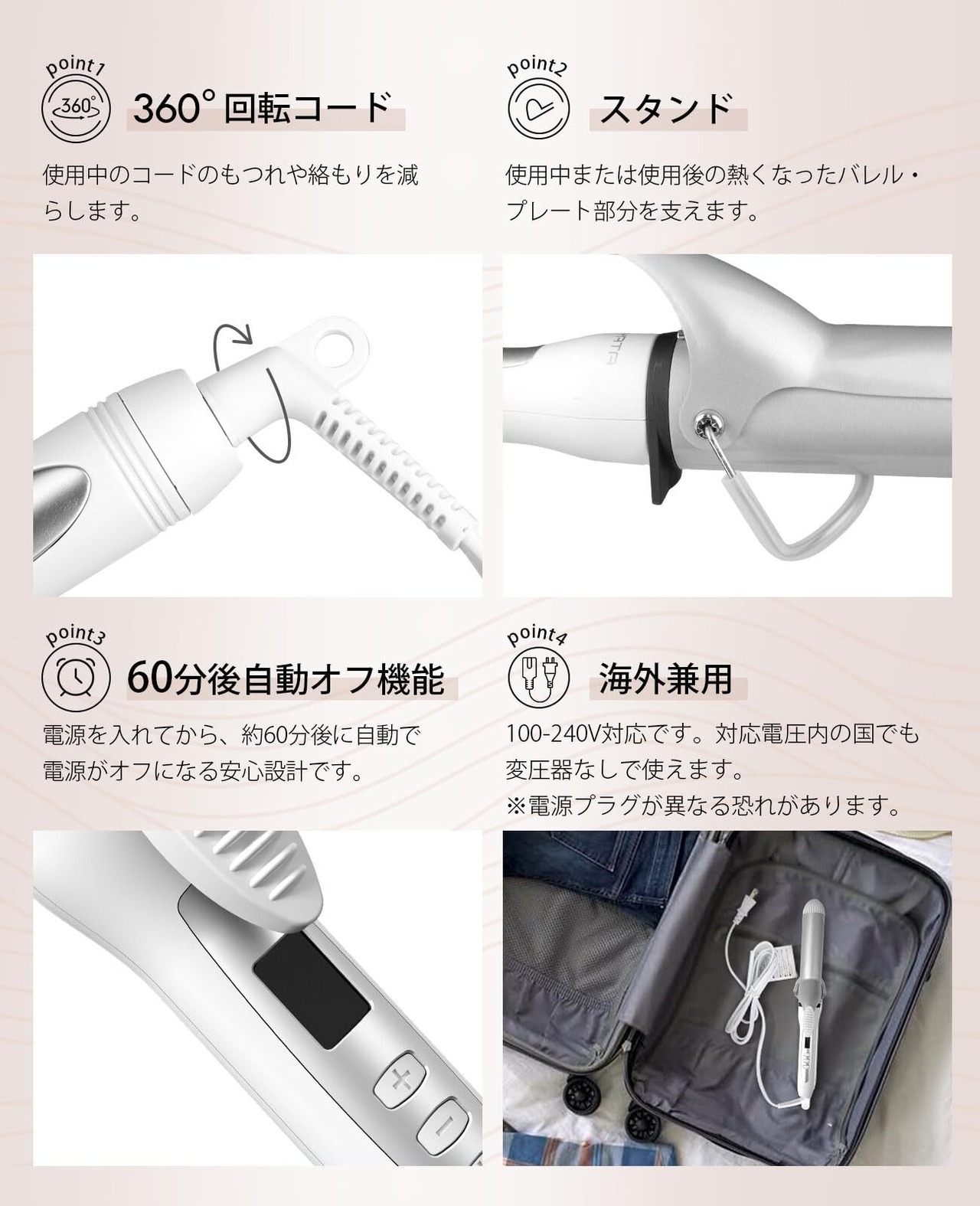 【100℃~220℃25段階の温度調節可能⇒髪質に最適な温度を見つける】当社のカールアイロンは最高温度220℃のプロ仕様で、100℃~220℃まで、5℃ごとに25段階で温度調整が可能です。髪質やヘアスタイルに応じて最適な温度を調節できます。また、耐熱性が強いスタンドを搭載しており、熱が冷めるのを待つことなく置けるのが便利です。