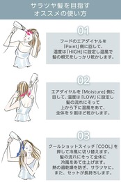 【モイスチャー】マイナスイオンと風を髪全体へ。広範囲に届けます。【ポイント】マイナスイオンと風を集中させる。髪の根元もしっかり乾かせます。※イメージ図
