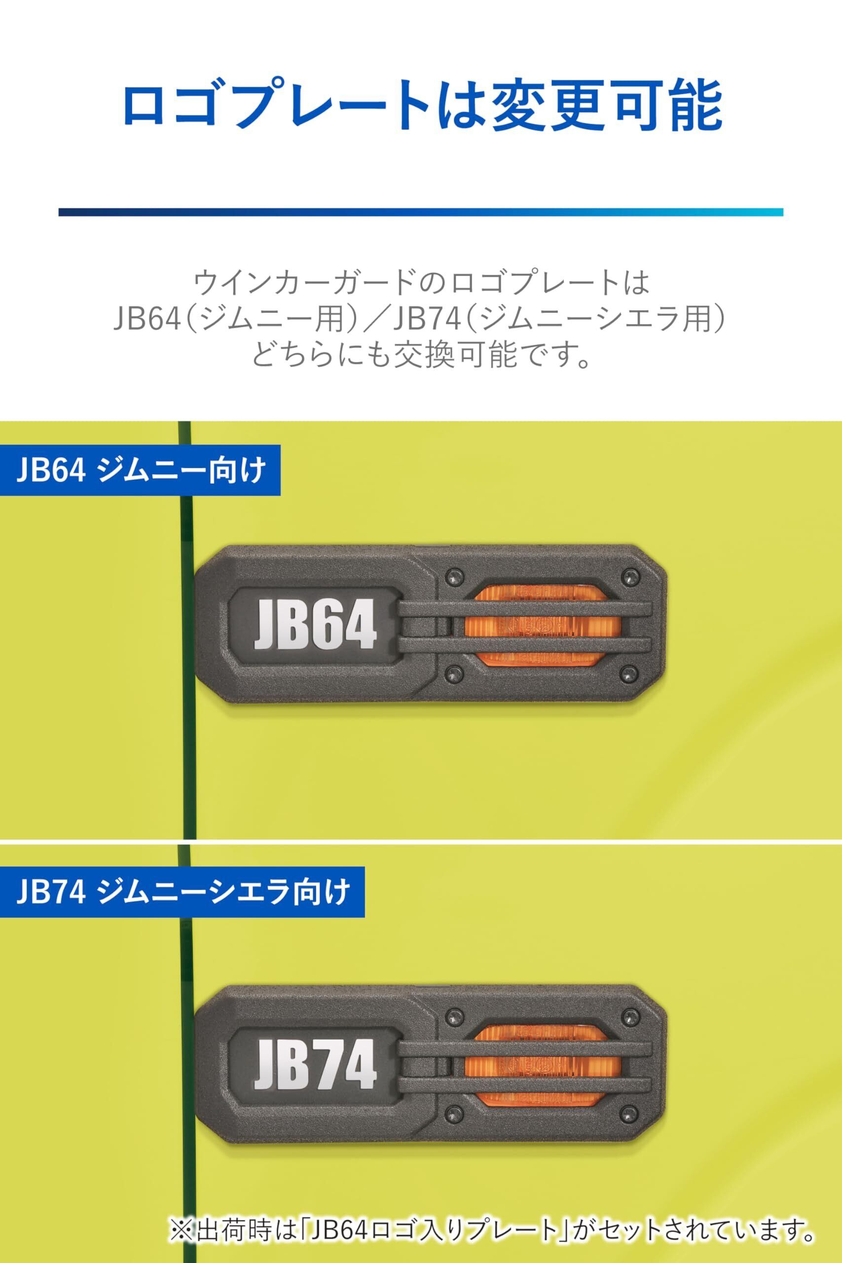 ウインカーガードにセットされているロゴプレートは交換が可能。 ジムニー/ジムニーシエラのどちらに取り付けるかで好きな方のロゴプレートをセットすることが可能です。 ※購入時は「JB64ロゴ入りプレート」がセットされています。「JB74ロゴ入りプレート」に交換する場合はマイナスドライバー(1番もしくは2番)とプラスドライバー(0番)が必要です。