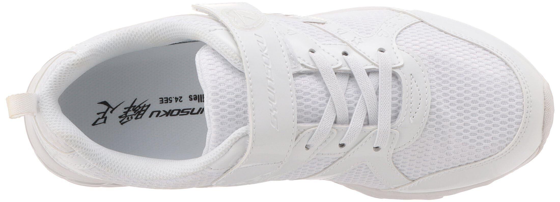 ソール(靴底)を含め、靴全体を白(オールホワイト)の通学履きに、服と合わせやすいシンプル・ベーシックなカラーを追加した運動靴になります。バンド部分にハート飾りが付いており、かわいい女の子らしいデザインです。