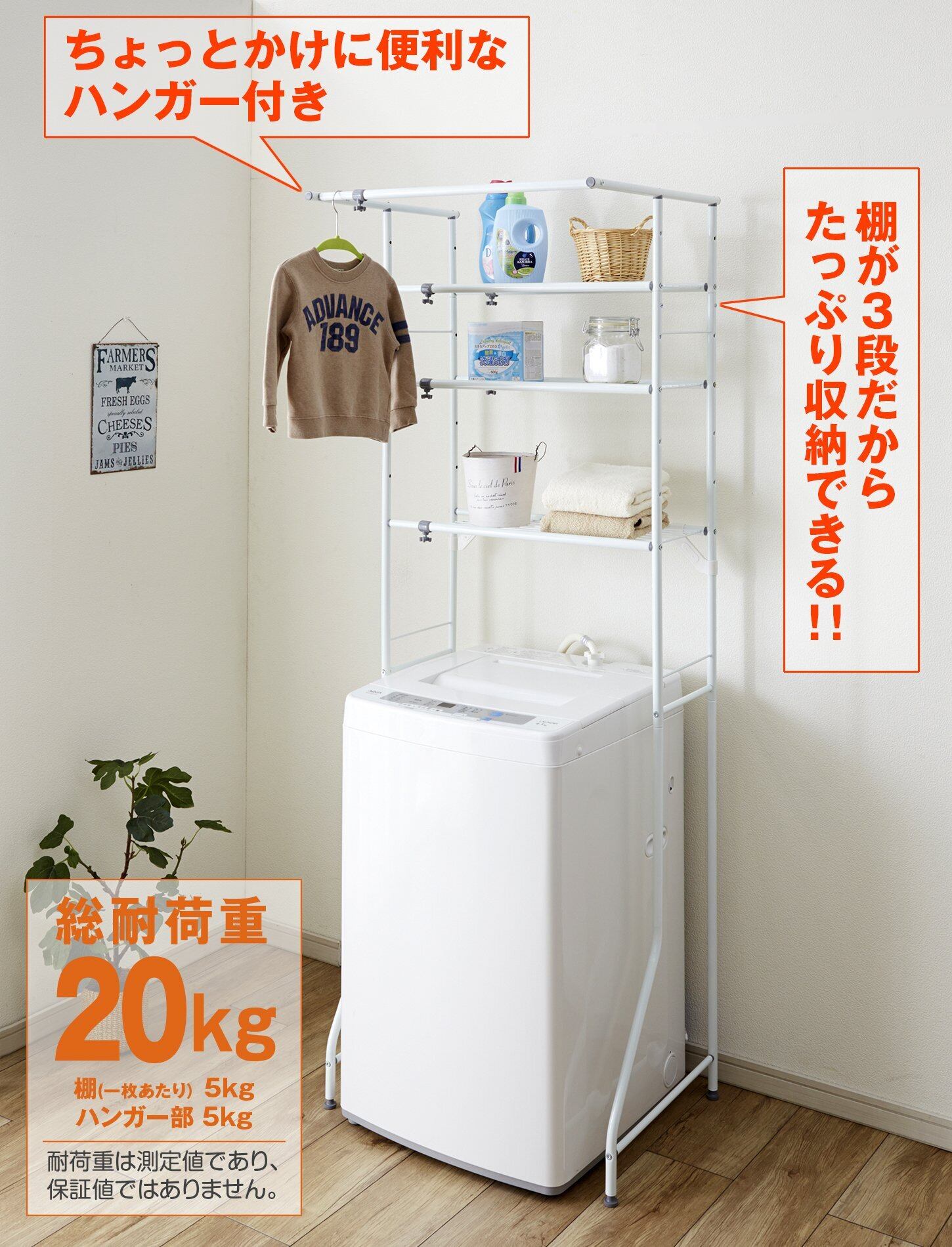【特徴】3段棚でたっぷりと収納できます。幅は伸縮式なのでいろんなサイズの洗濯機に対応できます。