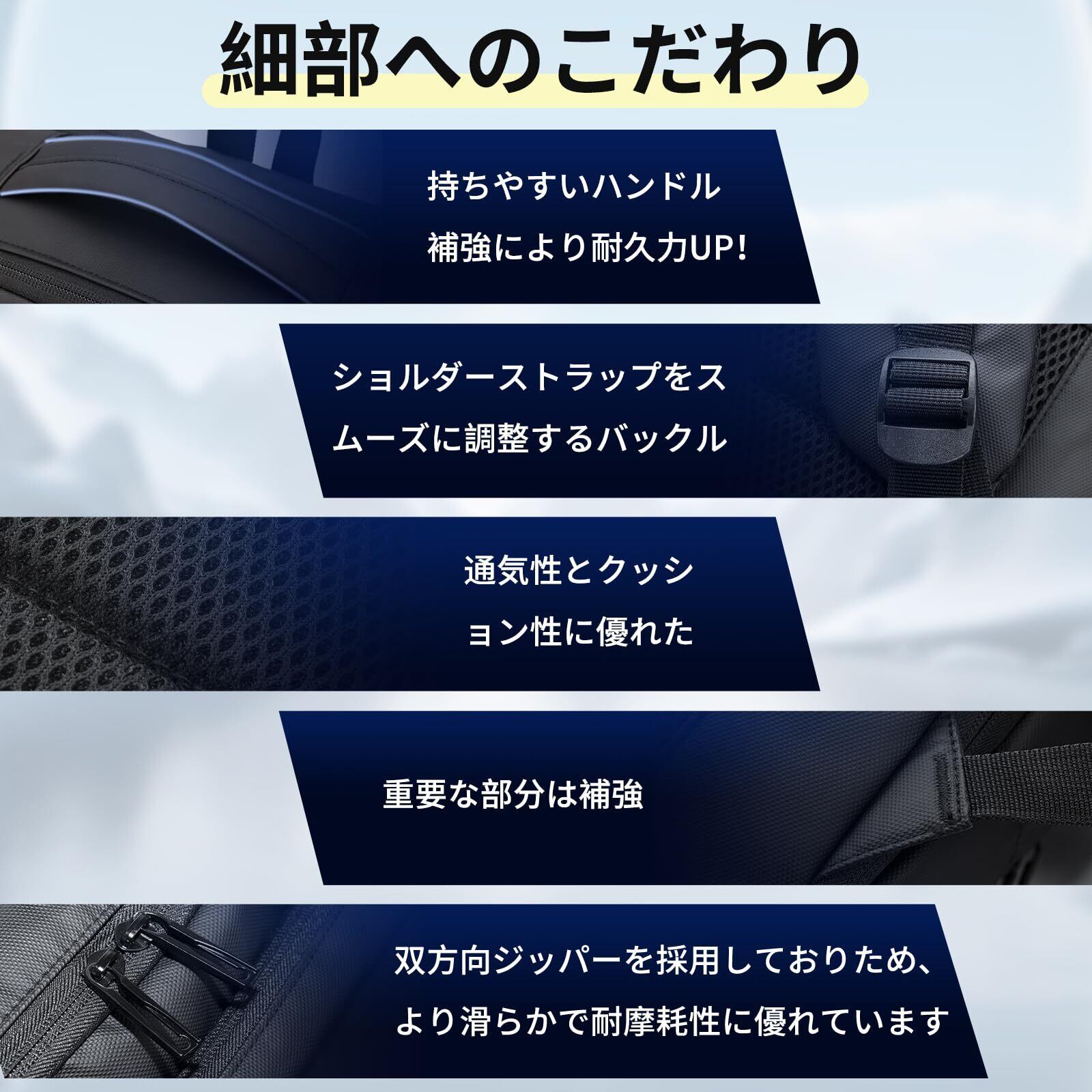 【便利な3 WAY】ショルダーベルトの太さが適切で、クッション性のある通気メッシュ素材を採用し、両肩の負担を軽減し、気楽に体に背負うことができます。ショルダーベルトの長さは調節でき、身長や性別の異なるお客様に適しています。また、三角形の二重縫いの技術を採用し、より良い耐荷重能力を備えており、断裂することの心配はありません。3WAY仕様(リュック、横手提げ、縦手提げタイプ)、お客様やビジネスパートナーの前でリュックを取り外すと安心できます。さらに重要なのは、出張旅行用のスーツケースに掛けることができる専用キャリーオン帯も付いています。
