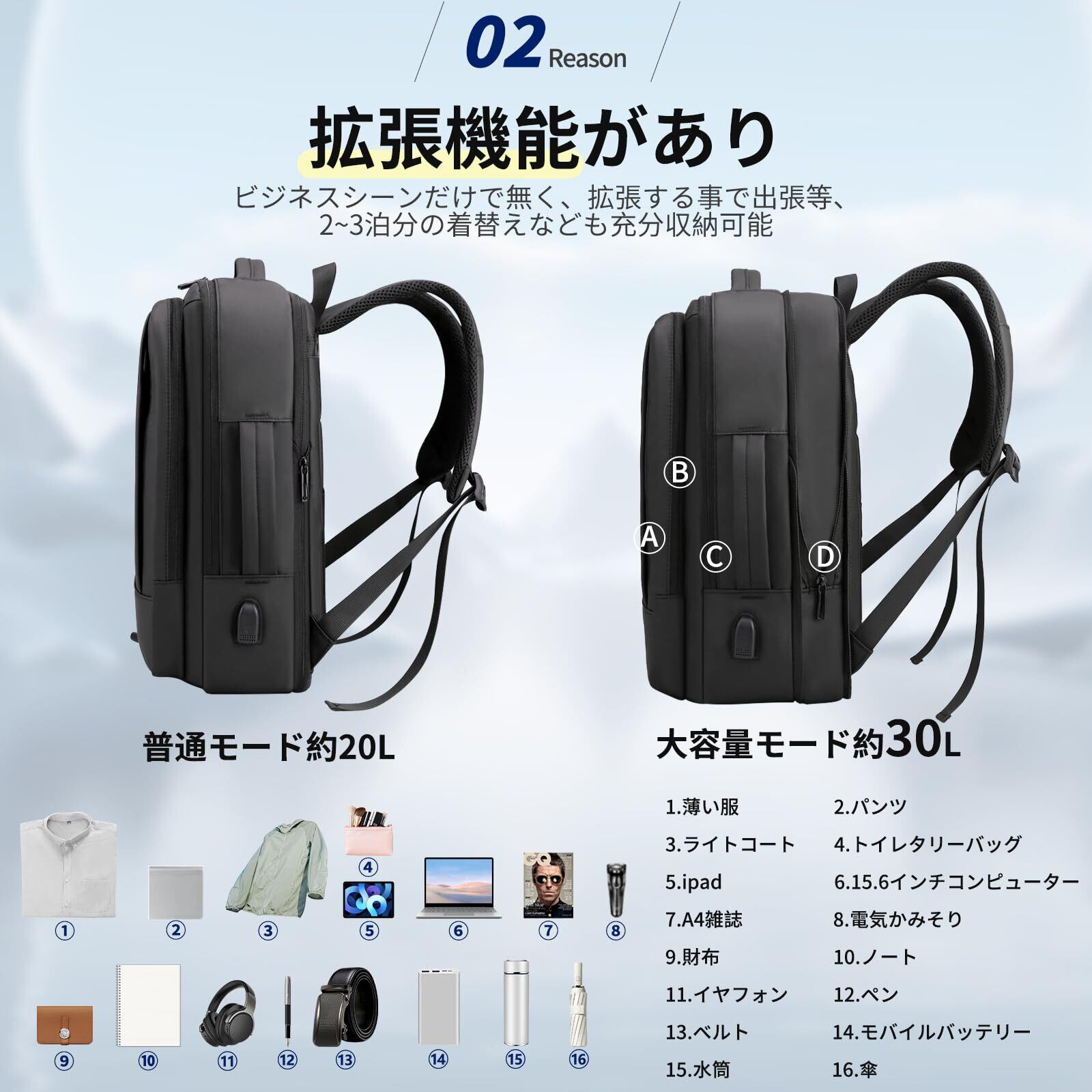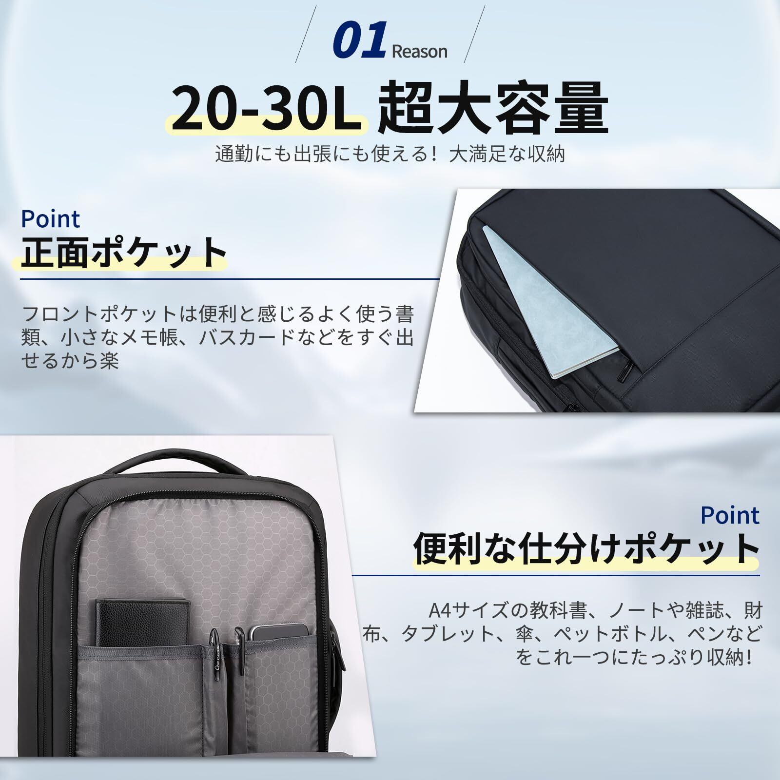 【マチ拡張&大容量収納】サイズ:45×34×12cm(拡張前:約20L)/45×34×20cm(拡張後:約30L)ポケットの数:11個(外側1/内側10)。リュックサックの1つの前置外ポケットは、いつでも取り出したい小物を簡単に収納できます。独立したパソコンポケットがあり、15.6インチのノートパソコンと 11インチのiPadを完全に収納できます。また、パソコンポケットのインナークッションは防震緩衝材とマジックシールの閉鎖方式を採用し、重要なパソコンとタブレットを保護することができます。マチ拡張前、リュックの厚みはわずか12cmなので取り回しやすく、日常の通勤にぴったりでした。拡張後、合計約30Lの貯蔵スペースと分倉設計は、1泊2日の出張に必要なすべてのものを収容できます。通勤、出張、通学、旅行など様々な場合に合わせて利用できます。