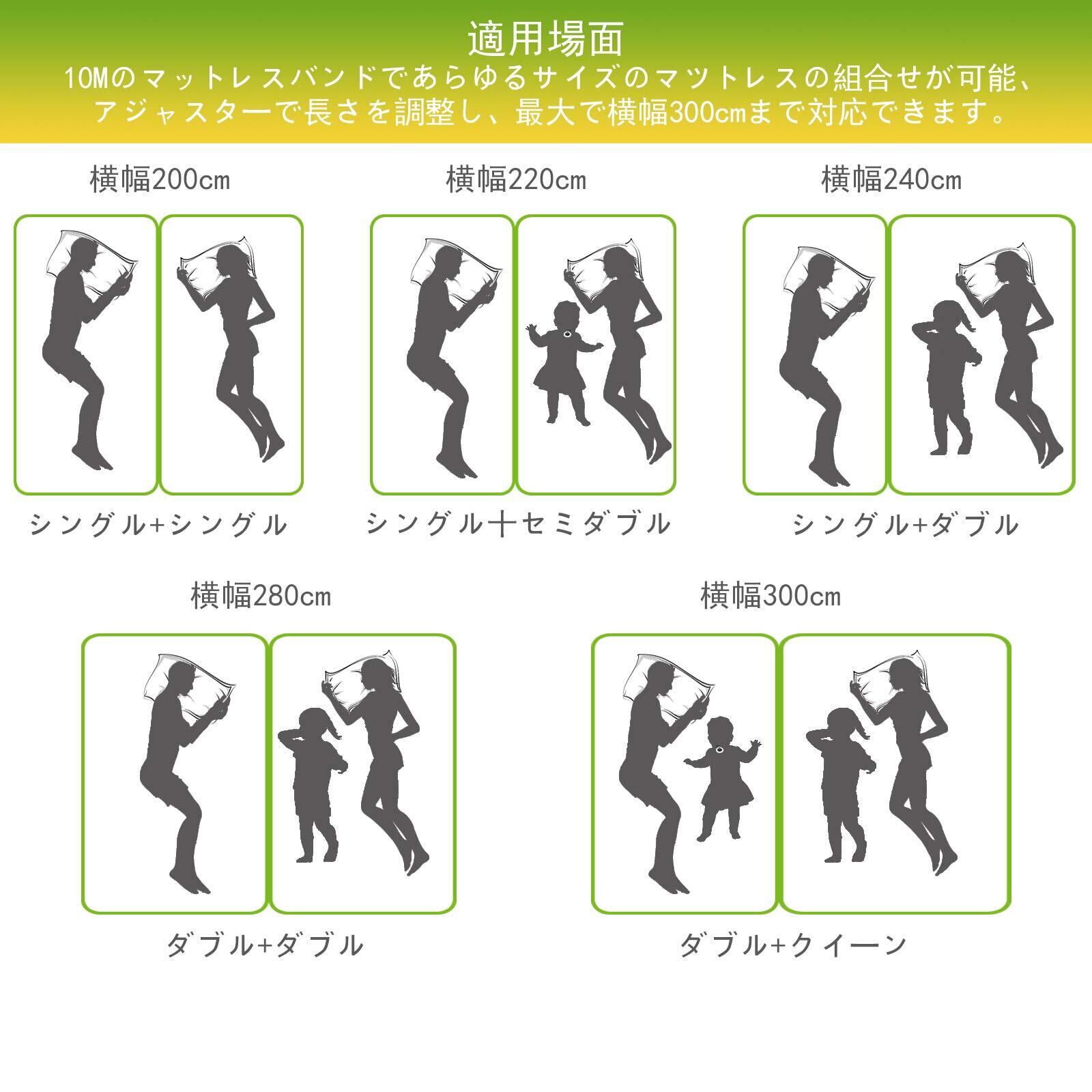 10メートルの超ロングマットレスバンド:ダブルサイズのマットレス2枚分、ダブル+クイーンのマットレス2枚分にも対応できるので、大家族でも安心です。