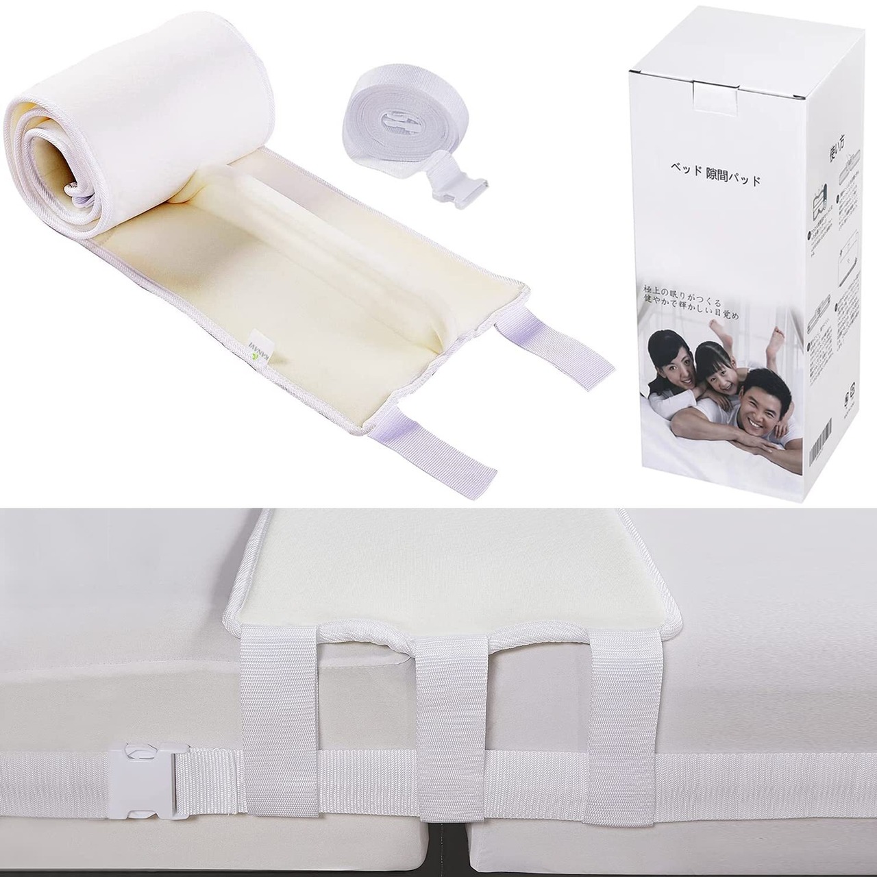 2つの人気商品がセットになったお得パッケージ:2枚のマットレスをしっかりと固定する「マットレスバンド」と、2枚のマットレスの間にできる隙間を埋める「すきまパッド」。2つの人気商品がセットになったお得なパッケージです!セットになっている連結バンドをマットレス全体に一周させることで、マットレス同士のズレを防ぐことができます。また、すきまパッドにはバンドを通す紐が付いており、バンドを締めることでしっかりと固定します。