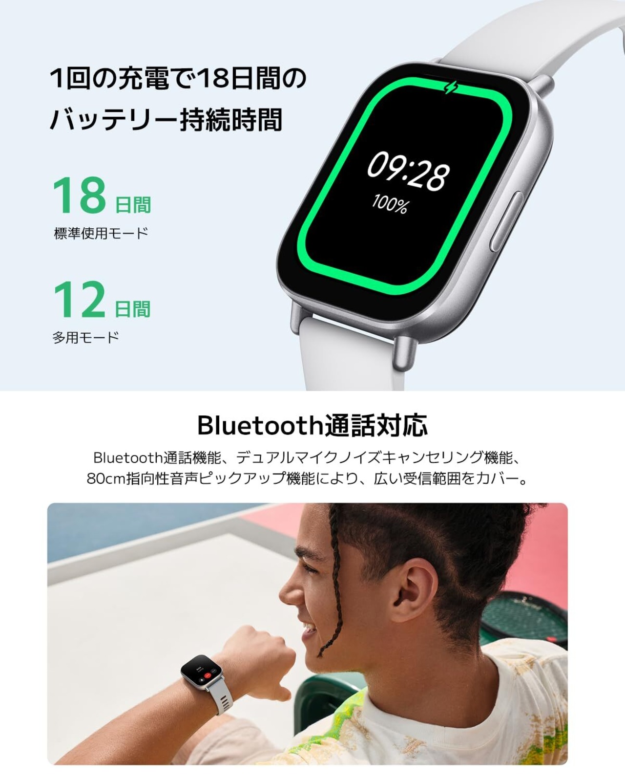 【デュアルマイクで離してもクリアな通話】Bluetooth通話機能、デュアルマイクノイズキャンセリング機能、80cm*指向性周音機能により、クリアで柔軟な通話が可能です。