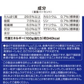 たんぱく質:29.5%以上、脂質:8.0%以上、粗繊維:7.0%以下、灰分:9.0%以下、水分:10.0%以下、カルシウム:0.7%標準値、リン:0.7%標準値、ナトリウム:0.6%標準値、マグネシウム:0.09%標準値、代謝エネルギー:約340kcal/100g