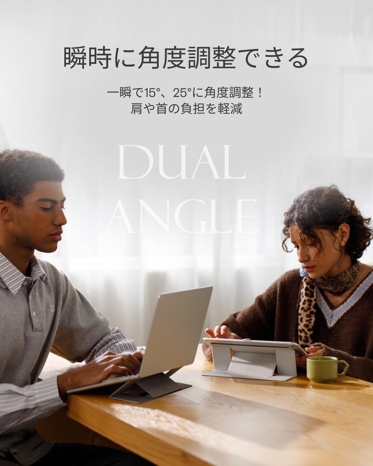 『2段階角度調整、簡単に切り替え』15°と25°の2段階角度調整で、あなたにぴったりの姿勢に。画面の高さを8cmまで上げられるので、猫背防止に役立ち、長時間作業による疲労を軽減します。取り付けが簡単、角度調整もスムーズで、1秒で作業モードに切り替えられ、快適な作業環境を整えられます。