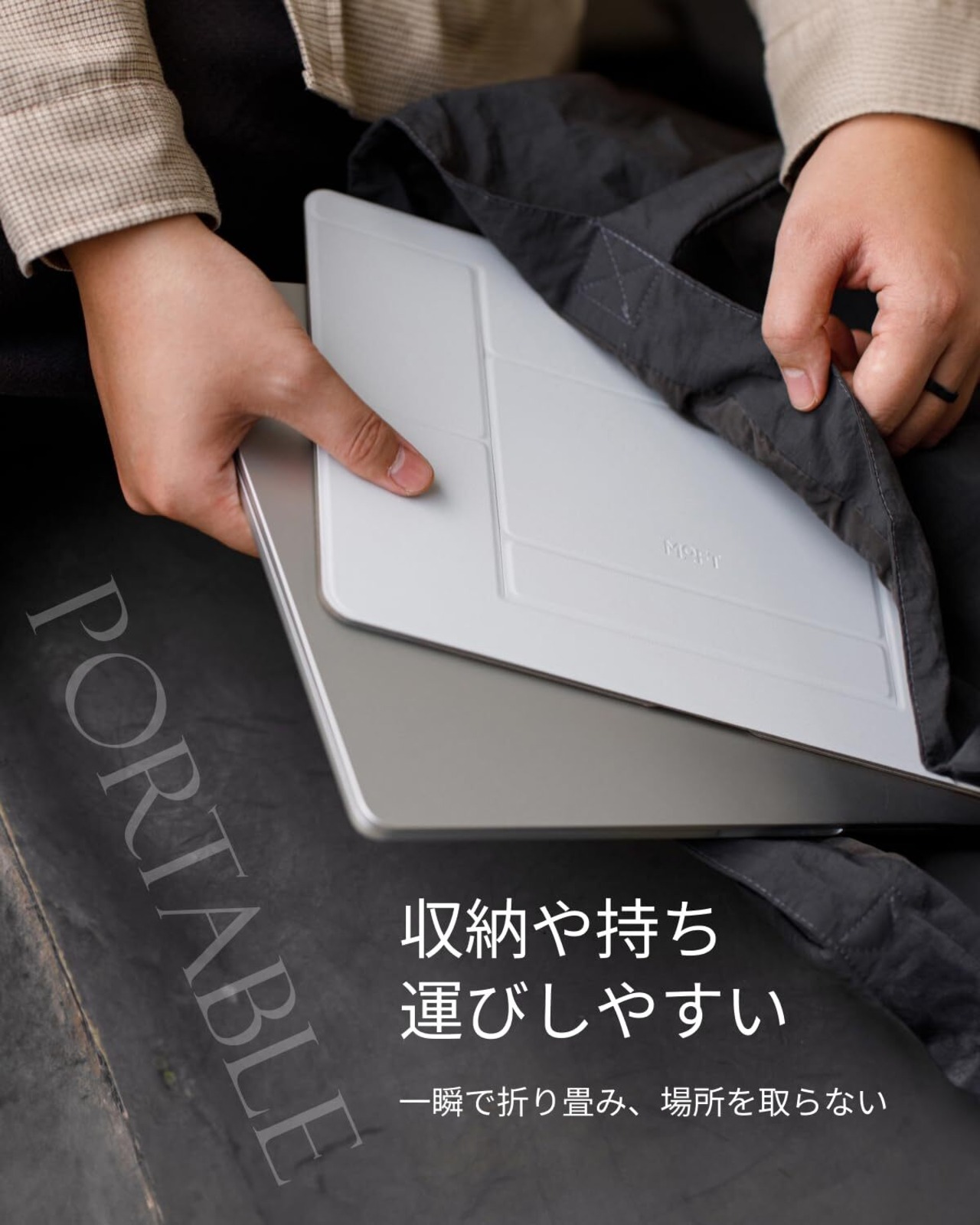 『一瞬で快適なワークスペースに』MOFTノートパソコンスタンドは、わずか一瞬でどこでも、どんな場所でも、快適なワークスペースを創出します。世界最薄クラスの折りたたみ式デザインは、カバンにすっぽり収まり、いつでもどこでも、あなたのオフィスへ変身。テレワーク、カフェ、移動中など、場所を選ばず、快適なタイピング体験をお届けします。
