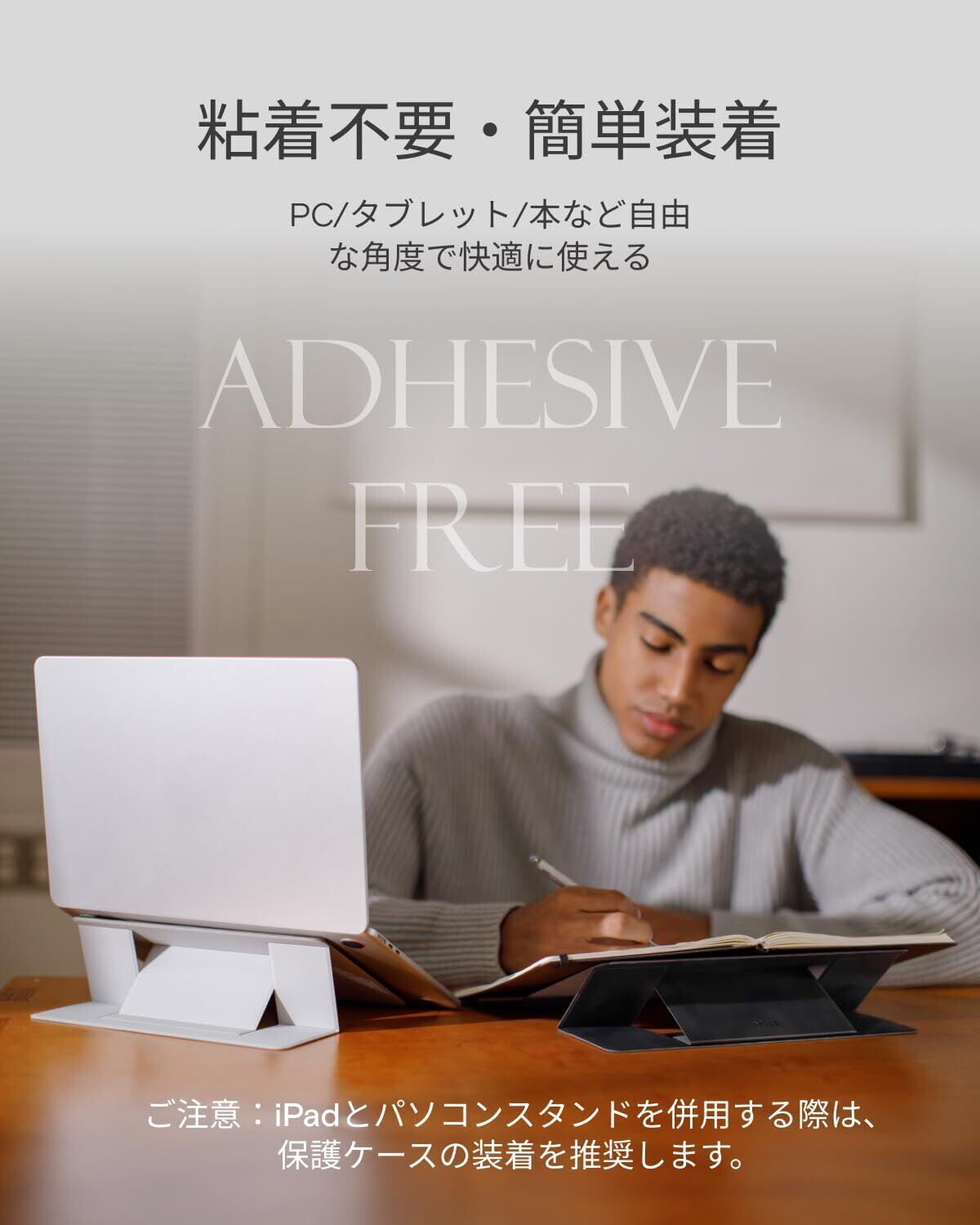 『非粘着タイプ、一台でマルチに活躍』ノートパソコンだけでなく、タブレット、本など、様々なデバイスに対応可能です。ノートパソコンに貼り付ける必要がなく、デバイスを傷つける心配もありません。一台でマルチに活躍するMOFTノートpcスタンドは、あなたのデジタルライフをより豊かにします。(ご注意:iPadとパソコンスタンドを併用する際、保護ケースの装着を推奨します。)