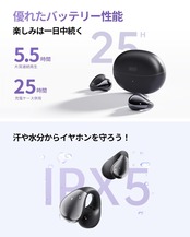 【音漏れ防止技術】耳を塞がないこのイヤフォンは、高度な指向性オーディオ技術と自動サウンドビーム調整機能を搭載しており、音が正確に耳に伝わります。電車やバスの中でも音漏れを最小限に抑えつつ、自分の音楽に没頭できるため、プライベートなリスニング体験を実現します。屋外スポーツやランニング、自宅での作業中、就寝前のリラックスタイムなど、さまざまなシーンでお気に入りのサウンドを楽しむことができます。【急速充電対応】イヤホン本体が満充電の状態で最大5.5時間、付属の充電ケースを合わせて使うと、最大25時間の音楽再生が可能です。※また急速充電に対応し、わずか10分の充電で2時間の再生が可能です。急な外出や通学通勤にも便利です。