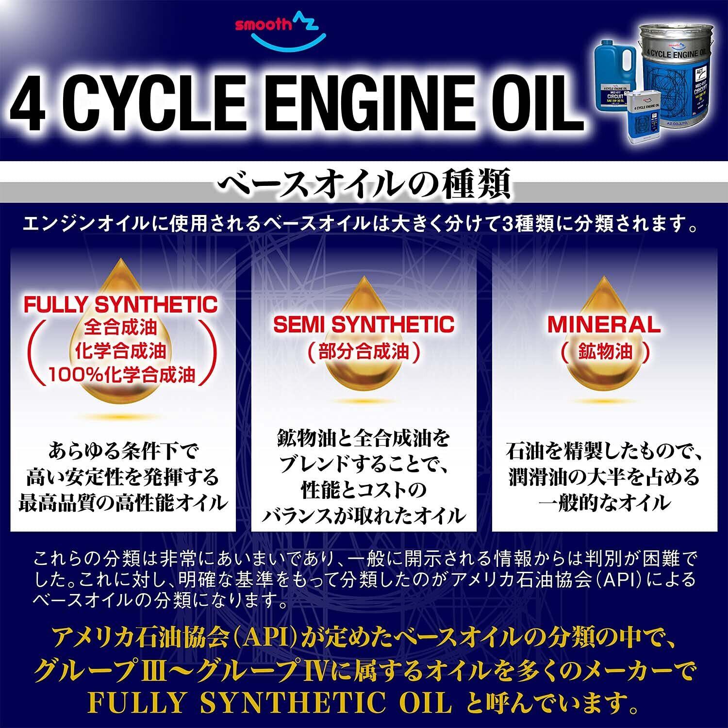 高性能4サイクルエンジンオイルです。化学合成油(全合成油)なので、従来の鉱物油に比べ、精製度が不純物が少ないため、劣化しにくいのが特徴です。