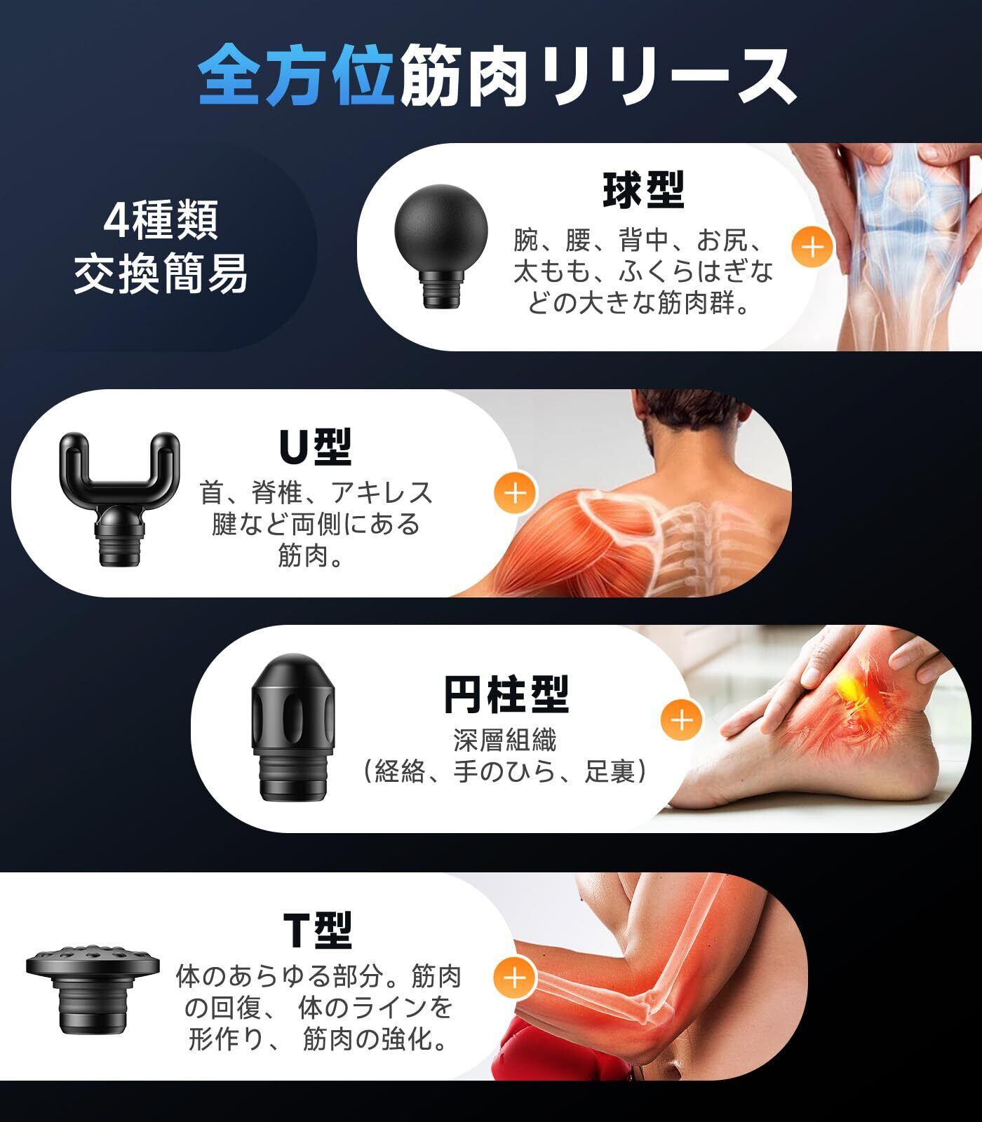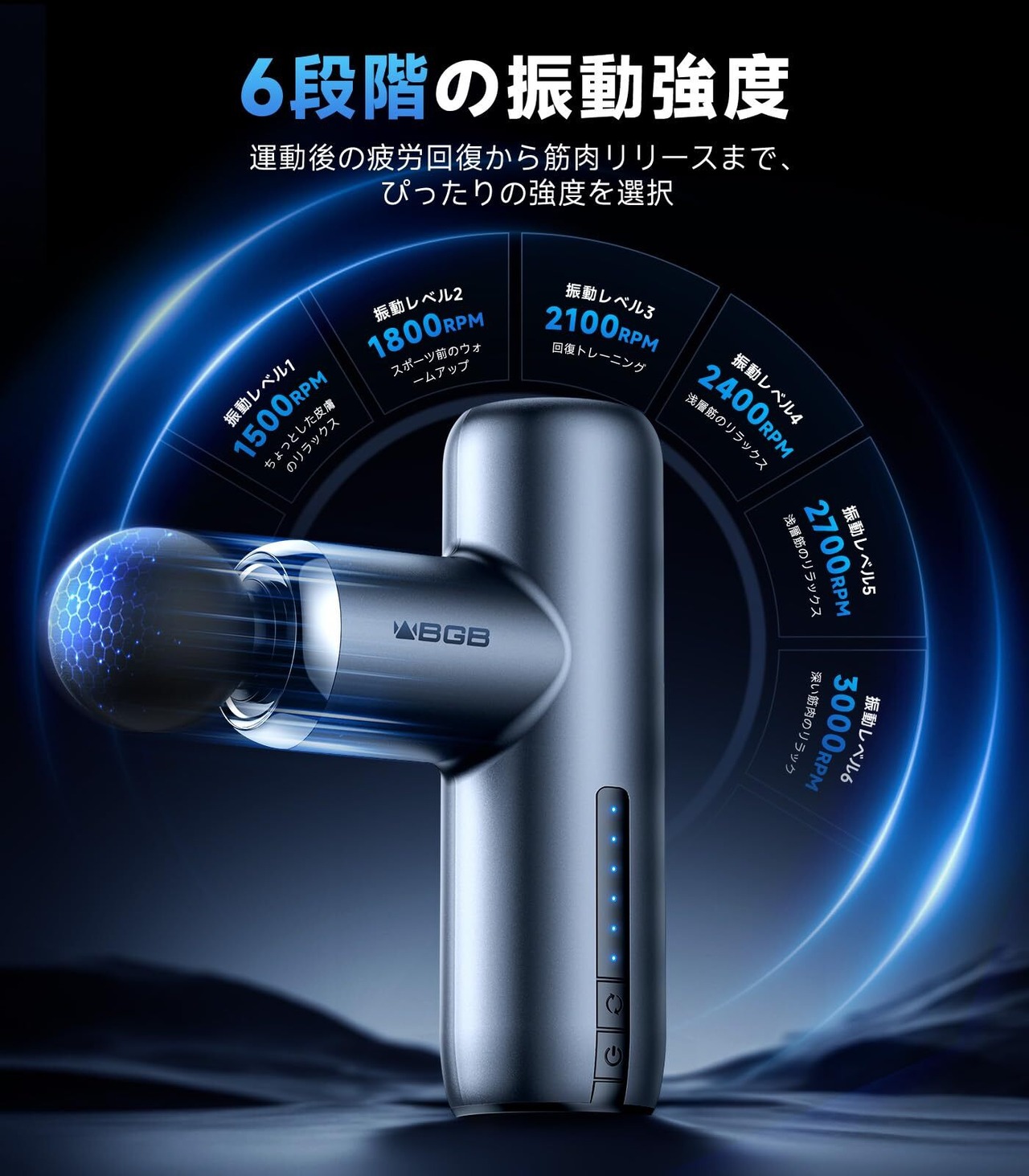 【6段階の振動レベル&マルチアタッチメント】1500RPM(レベル1)から3000RPM(レベル6)まで、6段階の振動強度を選択可能。 BGB筋膜リリースガンは環境に優しい素材で作っ交換可能なアタッチメントが4種類用意され、お好みやストレス具合に組み合わせて体を絶好調まで癒そう!※ご使用上の注意:1.ヘッド交換時は必ず電源をオフにしてください。2.同一部位への連続使用は3分以内を推奨。3.痛みや不快感を感じた場合は直ちに中止。