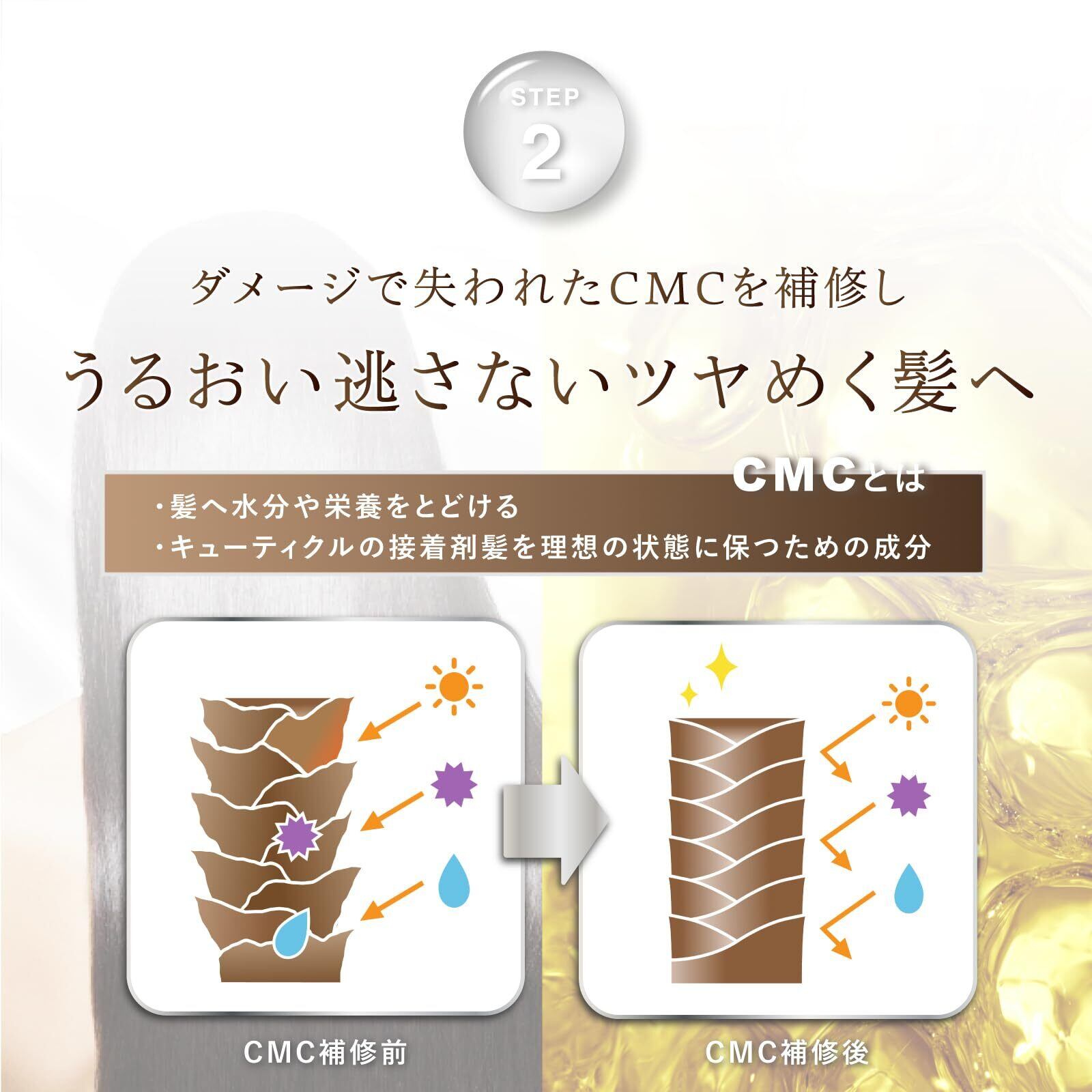 商品特長 ドライヤーやヘアアイロンの熱を味方にしてダメージを補修。 CMCを補修して毛髪内部の潤いを保ちまとまりのある毛髪へ導きます。