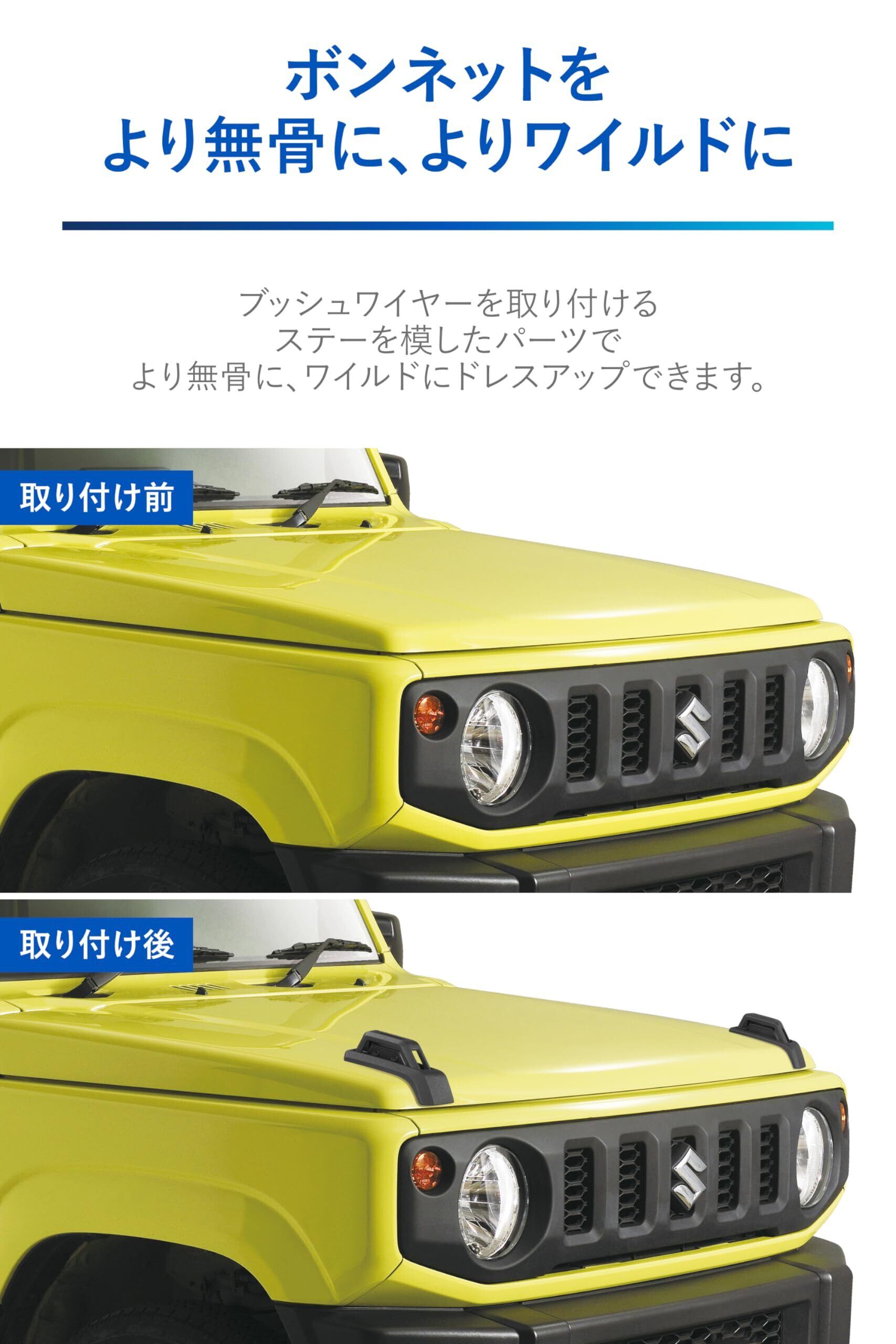 ボンネットを無骨にドレスアップするブッシュワイヤーステー ボンネットに貼り付けるだけでカンタンに無骨に仕上げることができるドレスアップパーツです。 ブッシュワイヤーを取り付けるステーを模したパーツとなっており、ボンネットをより無骨に、よりワイルドにドレスアップできます。