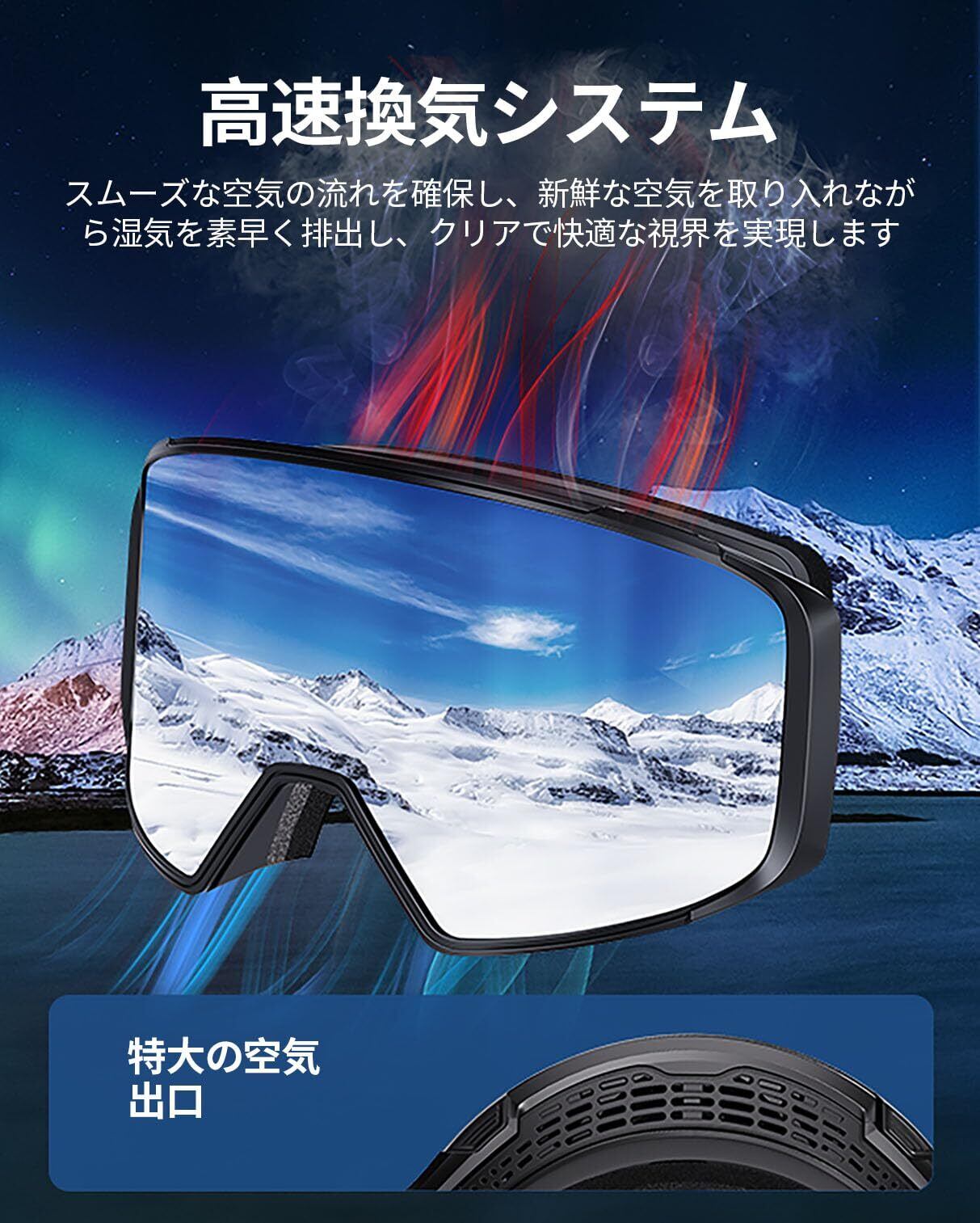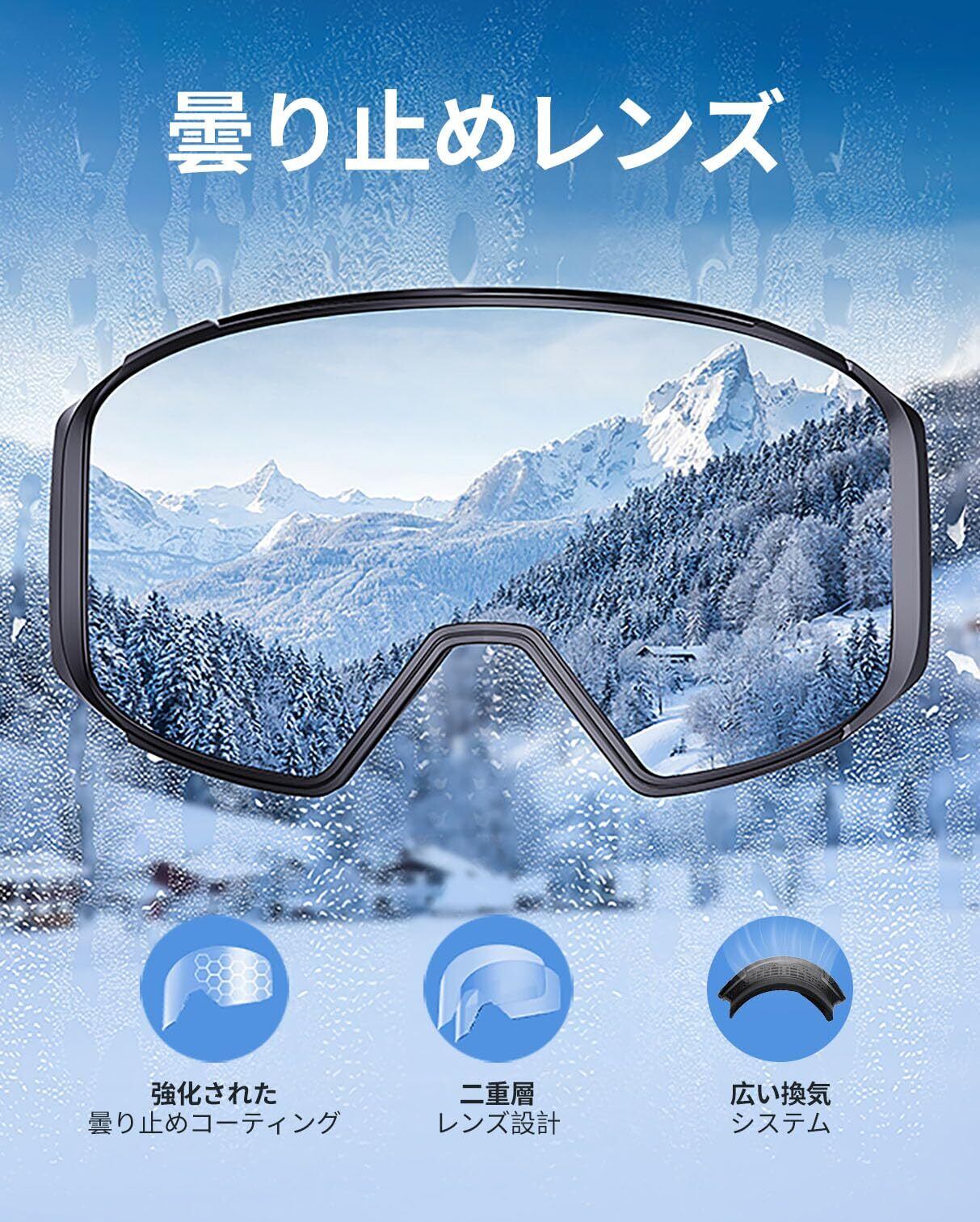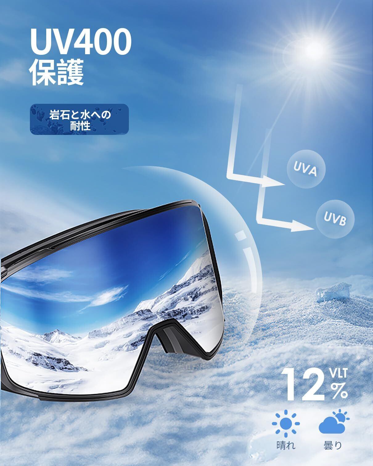 マグネット式レンズ交換可スキーゴーグル: 新型スキーゴーグルは磁気レンズを採用して、僅か2秒でレンズを交換できます。レンズの両側に特殊な止め具設計で、磁気レンズとのダブルレンズの2層保護。優れにフレームの柔軟性や耐衝撃: フレームは高品質のTPU素材を採用されており、柔らかく耐久性があり、曲げても変形せず、寒冷地でも良好な弾性を維持します耐荷重性、耐衝撃性、耐久性に優れています。 スノーゴーグルの顔に当てる部分は3層の柔らかいスポンジでできており、人間工学に基づき、顔に自然にフィットするように設計され、衝撃を吸収し、密封されることで、耐雪性、耐風性、耐衝撃性に優れた耐久性のあるデザインとなっている鼻や耳を圧迫することなく顔への圧力を分散し、積もった雪が除去しやすく水分の侵入を予防し、顔や目を寒さから守ることで、より快適なゴーグル装着感を提供します