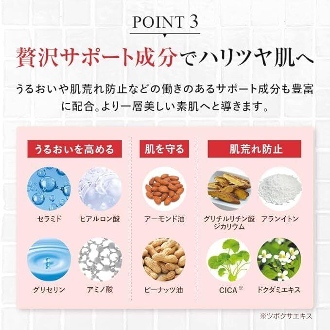 ✨毛穴の目立ちが使うほどに軽減:ピーリング系の洗浄成分が毛穴の詰まりを溶かし排出し、同時に引き締め効果の高い「アーチチョーク葉エキス」を配合し、毛穴の目立ちをケアします。 ✨黒ずみの発生を軽減:レチノール*やフルーツ酸には皮脂抑制効果もあり、落とすと抑制の相互作用で黒ずみを予防します。* パルミチン酸レチノール