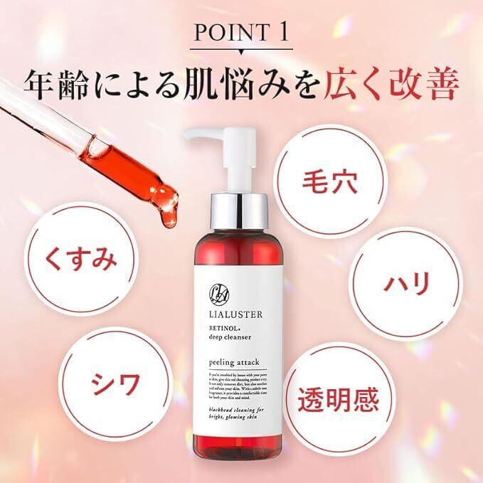 ✨シリーズ累計150万個突破!メイクを落とすたびにつるんとした新しい肌になれるレチノール*ディープクレンザー:安定型レチノール*、AHA(フルーツ酸)、BHA(サリチル酸)などの低刺激なピーリング成分で肌トラブルを除去するピーリングクレンズ。クリニック発想の洗浄技術で、メイクと一緒に毛穴汚れやくすみをオフし、クリアな潤い素肌に導きます。* パルミチン酸レチノール ●その他主な成分(一部):水、ヤシ油脂肪酸PEG-7グリセリル グリコール酸0.0007 w/w%