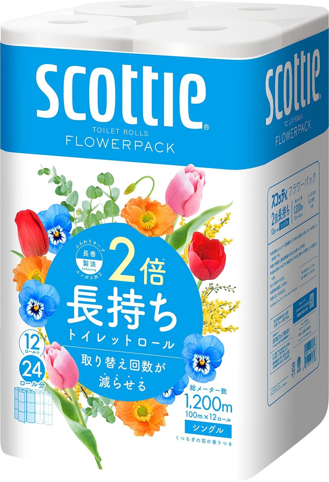 スコッティ 【ケース販売】 フラワーパック 2倍巻き(12ロールで24ロール分) トイレット 100mシングル ホワイト ×4パック入り