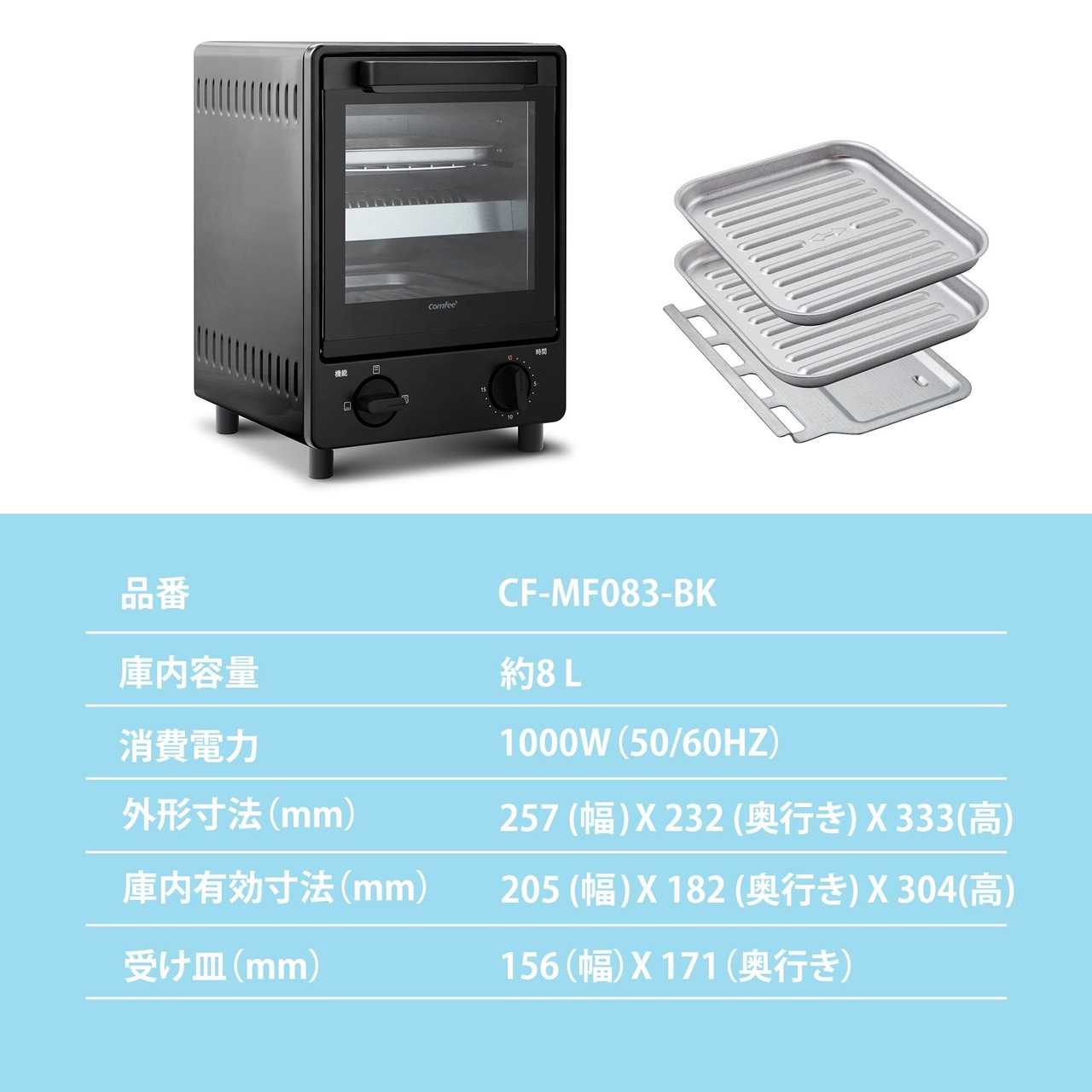 【商品仕様】COMFEE' 縦型オーブントースター:◇コンパクトなサイズ:幅25.8x奥行き23.2x高さ33.3㎝、約3kg ◇容量:8L、トースト2枚焼き ◇電源:AC100V ◇最大出力:1,000W ◇タイマー:最大15分 ◇機能:ピザ・トースト・切り餅・グラタン・バターロールなどの焼き料理◇加熱モード:上下中ヒーター・下ヒーター・上中ヒーター◇電源コード長さ:1m◇付属品:パンくずトレイ*1・受け皿*2・日本語取扱説明書※ 製品保証期間:一年間
