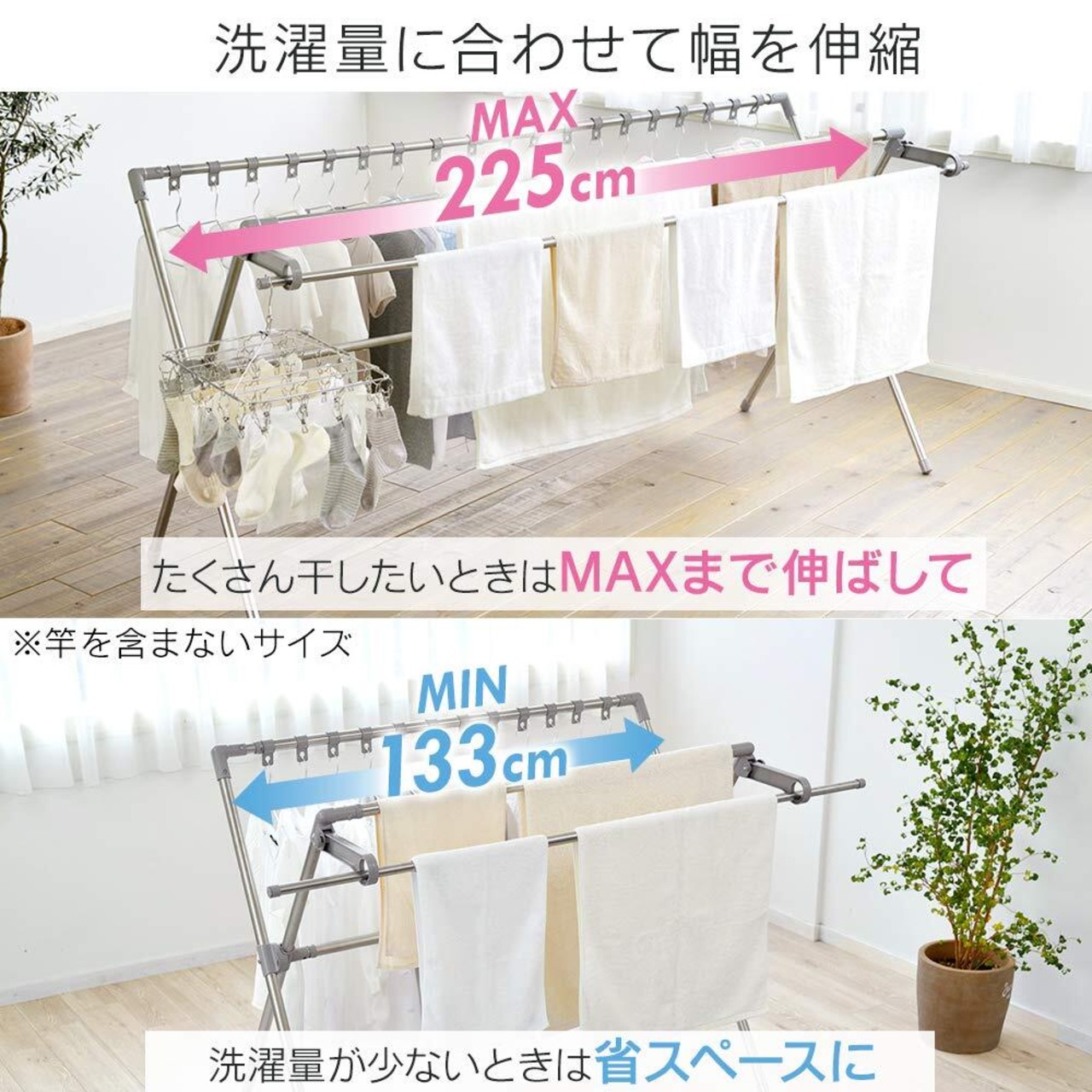 たくさん干したいときはMAXまで伸ばして、衣類やタオルもたっぷり干せる。